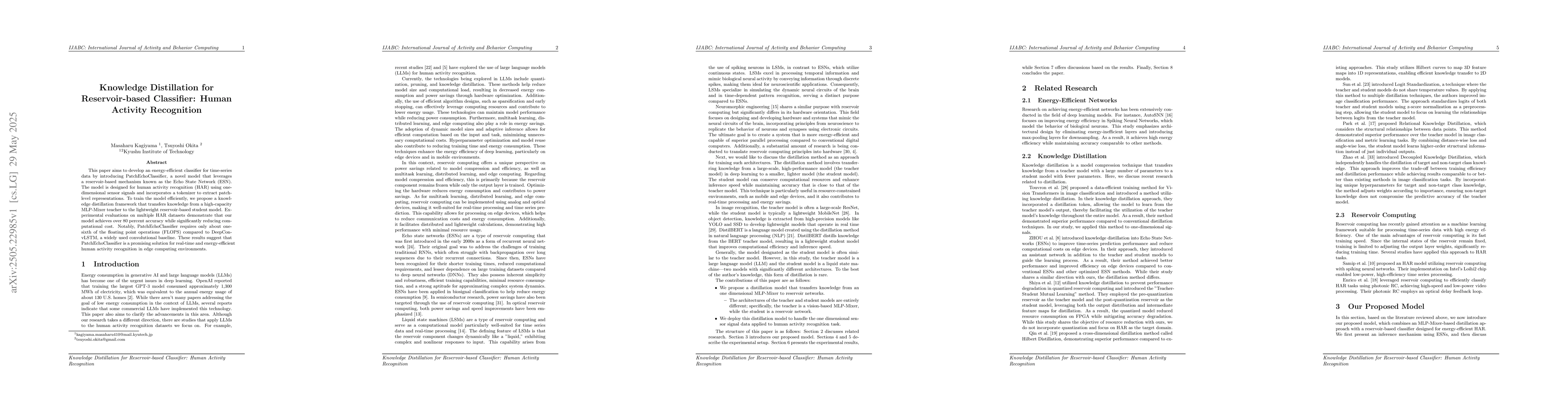 The research introduces PatchEchoClassifier, a reservoir-based classifier using Echo State Networks (ESN) for human activity recognition (HAR) from one-dimensional sensor signals. It employs a tokenizer to extract patch-level representations and a knowledge distillation framework to efficiently train the lightweight model from a high-capacity MLP-Mixer teacher.