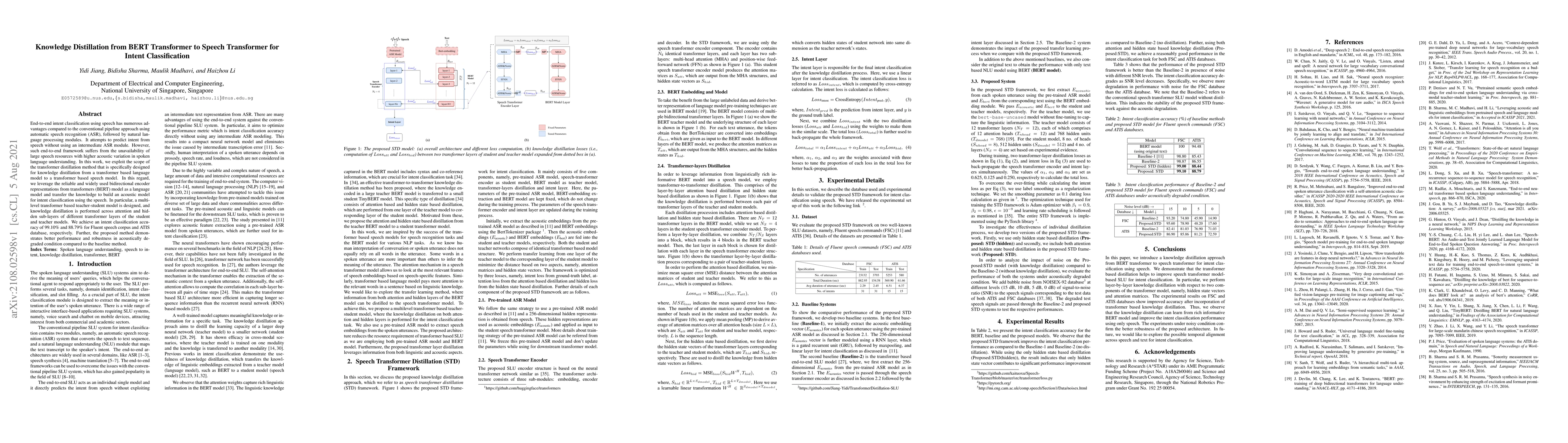 This paper explores an end-to-end intent classification framework for speech, using knowledge distillation from a BERT language model to a speech transformer model. The proposed multilevel transformer-based teacher-student model achieves high accuracy (99.10% for Fluent speech and 88.79% for ATIS) and shows improved robustness under degraded acoustic conditions compared to baselines.