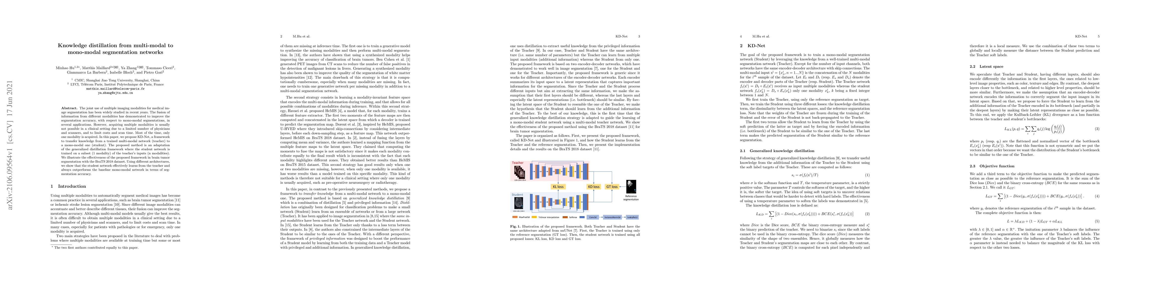 The joint use of multiple imaging modalities for medical image segmentation has been widely studied in recent years. The fusion of information from different modalities has demonstrated to improve the segmentation accuracy, with respect to mono-modal segmentations, in several applications. However, acquiring multiple modalities is usually not possible in a clinical setting due to a limited number of physicians and scanners, and to limit costs and scan time. Most of the time, only one modality is acquired. In this paper, we propose KD-Net, a framework to transfer knowledge from a trained multi-modal network (teacher) to a mono-modal one (student). The proposed method is an adaptation of the generalized distillation framework where the student network is trained on a subset (1 modality) of the teacher's inputs (n modalities). We illustrate the effectiveness of the proposed framework in brain tumor segmentation with the BraTS 2018 dataset. Using different architectures, we show that the student network effectively learns from the teacher and always outperforms the baseline mono-modal network in terms of segmentation accuracy.