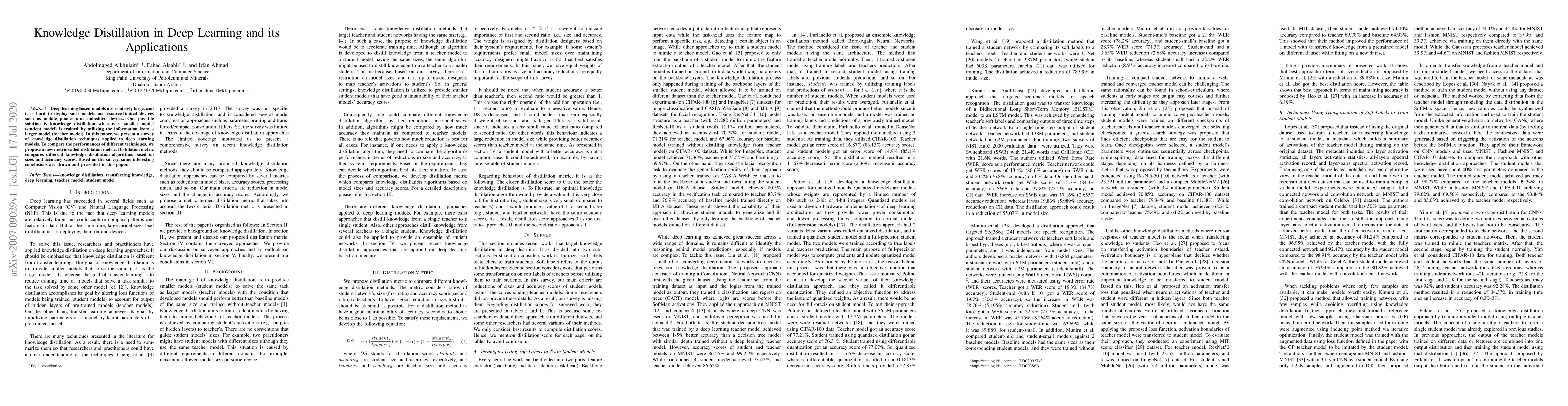 This paper surveys knowledge distillation techniques for training smaller deep learning models using information from larger models, proposing a new distillation metric to compare performance based on size and accuracy. Conclusions drawn highlight the effectiveness of various distillation methods.