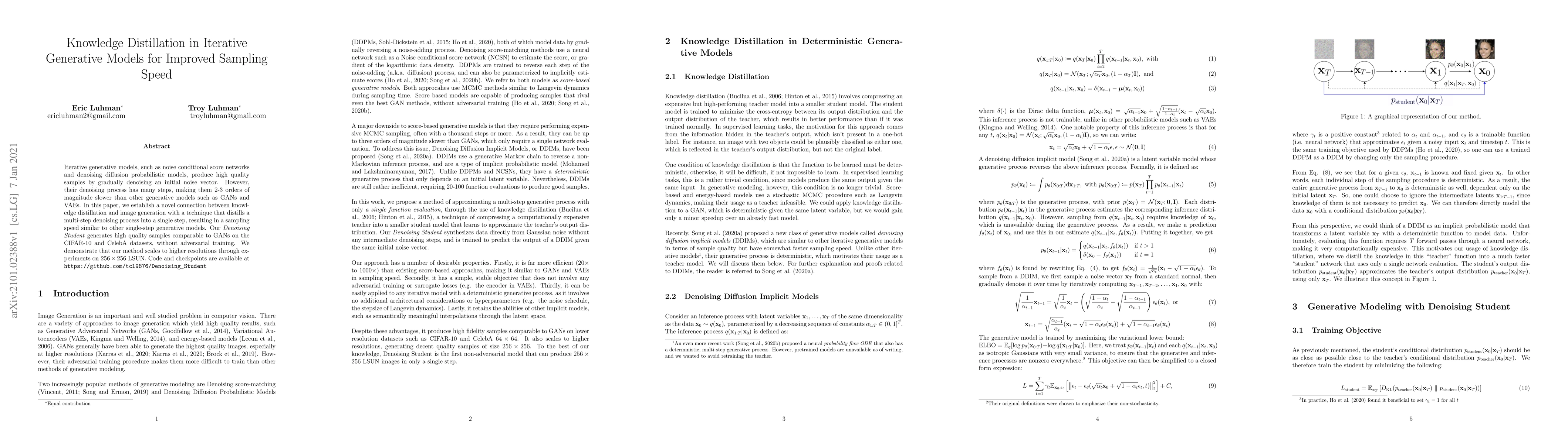Researchers developed a technique to accelerate iterative generative models by distilling their multi-step denoising process into a single step, achieving sampling speeds comparable to other single-step models.