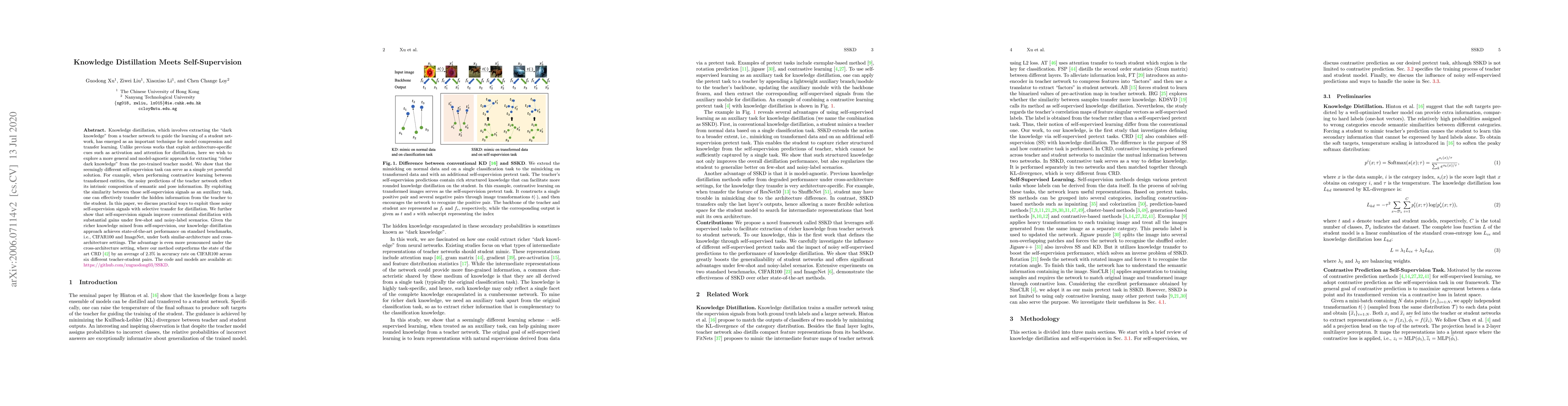 This paper proposes a novel knowledge distillation method that leverages self-supervision to extract richer "dark knowledge" from a pre-trained teacher model, enhancing the learning of a student network. The self-supervision signals, particularly from contrastive learning, are used to improve conventional distillation, leading to state-of-the-art performance on CIFAR100 and ImageNet benchmarks.