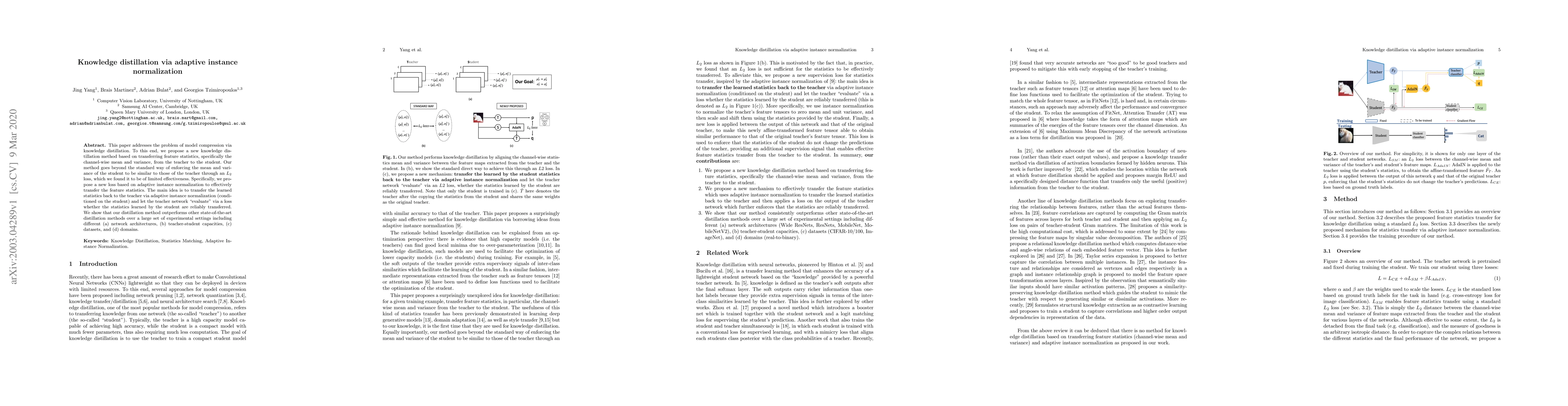 This paper proposes a novel knowledge distillation method using adaptive instance normalization to transfer feature statistics from teacher to student, outperforming other methods across various network architectures, capacities, datasets, and domains. The method enhances feature statistic transfer beyond standard $L_2$ loss by leveraging adaptive instance normalization.