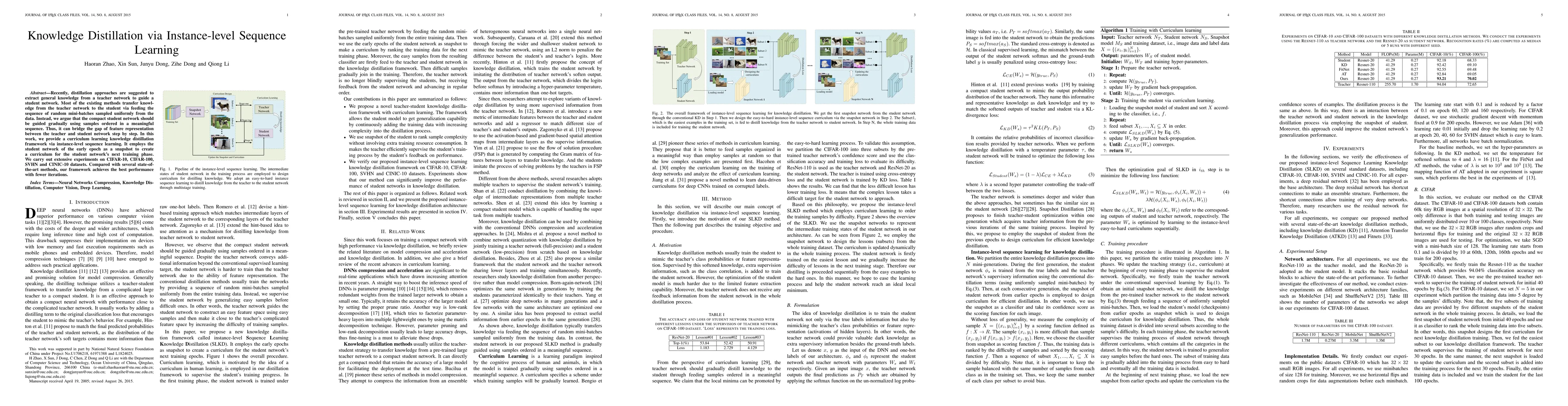 This paper proposes a knowledge distillation method using instance-level sequence learning for curriculum learning, guiding the student network progressively through ordered samples to better align the feature representations. Experiments on CIFAR, SVHN, and CINIC datasets show superior performance compared to state-of-the-art methods.