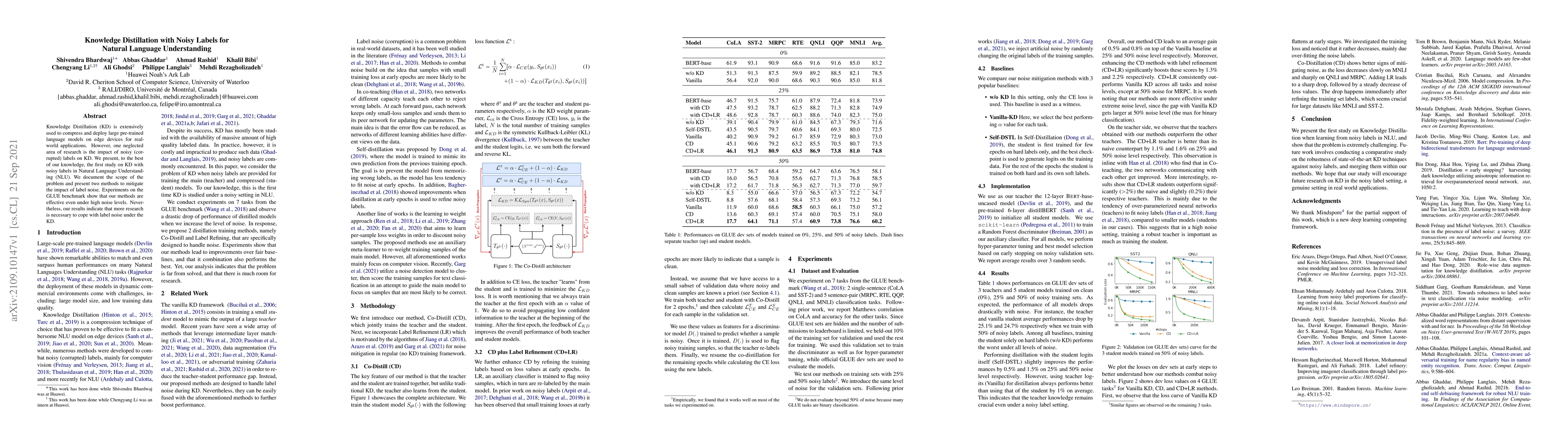 This paper investigates the impact of noisy labels on Knowledge Distillation (KD) for Natural Language Understanding (NLU), presenting the first study on this topic. It proposes two methods to mitigate label noise and demonstrates their effectiveness on the GLUE benchmark, highlighting the need for further research in this area.
