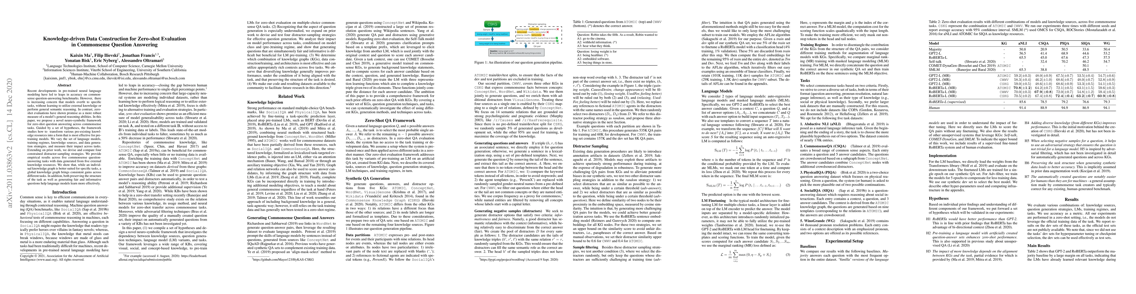 Recent developments in pre-trained neural language modeling have led to leaps in accuracy on commonsense question-answering benchmarks. However, there is increasing concern that models overfit to specific tasks, without learning to utilize external knowledge or perform general semantic reasoning. In contrast, zero-shot evaluations have shown promise as a more robust measure of a model's general reasoning abilities. In this paper, we propose a novel neuro-symbolic framework for zero-shot question answering across commonsense tasks. Guided by a set of hypotheses, the framework studies how to transform various pre-existing knowledge resources into a form that is most effective for pre-training models. We vary the set of language models, training regimes, knowledge sources, and data generation strategies, and measure their impact across tasks. Extending on prior work, we devise and compare four constrained distractor-sampling strategies. We provide empirical results across five commonsense question-answering tasks with data generated from five external knowledge resources. We show that, while an individual knowledge graph is better suited for specific tasks, a global knowledge graph brings consistent gains across different tasks. In addition, both preserving the structure of the task as well as generating fair and informative questions help language models learn more effectively.
