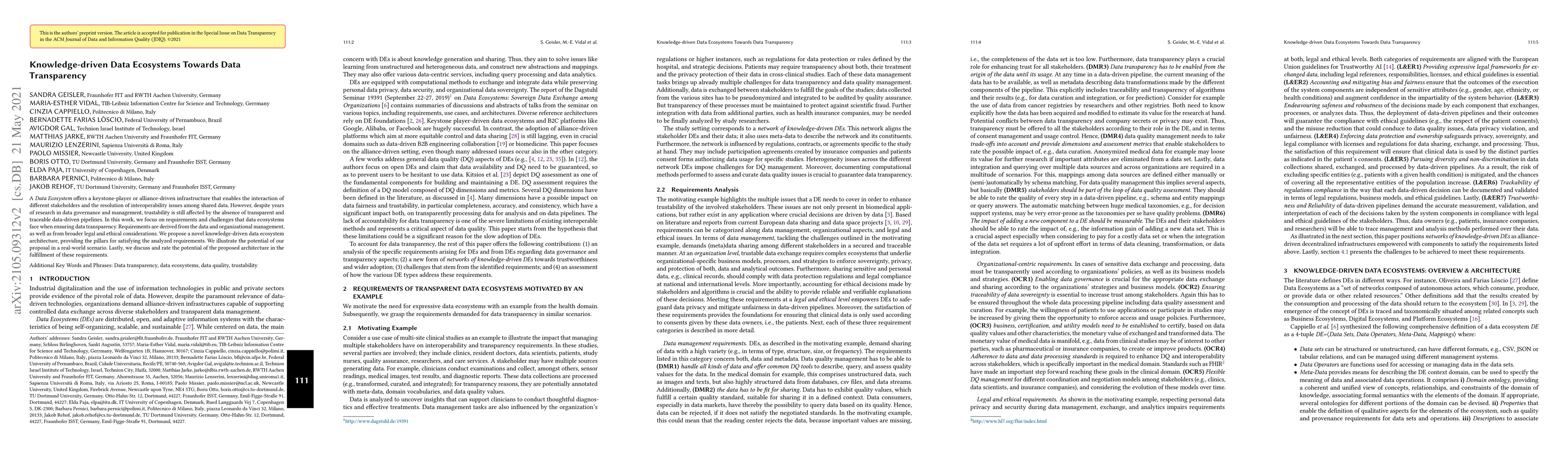 This research paper proposes a knowledge-driven data ecosystem architecture to ensure data transparency, addressing trustability issues in data governance and management. It outlines requirements and challenges from various perspectives and evaluates the potential of its proposed architecture.