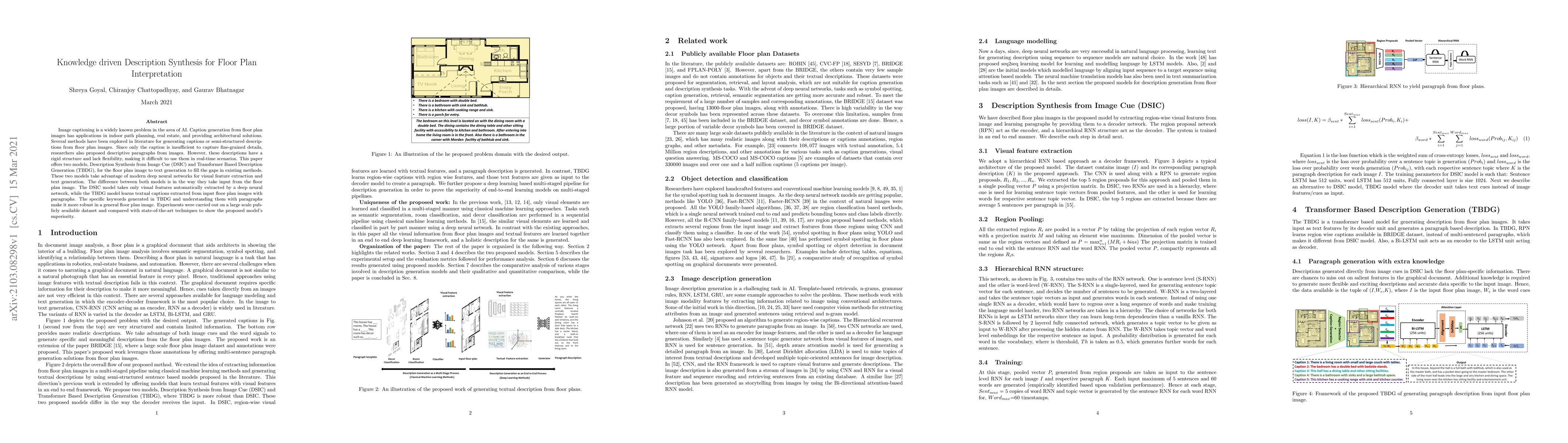 Image captioning is a widely known problem in the area of AI. Caption generation from floor plan images has applications in indoor path planning, real estate, and providing architectural solutions. Several methods have been explored in literature for generating captions or semi-structured descriptions from floor plan images. Since only the caption is insufficient to capture fine-grained details, researchers also proposed descriptive paragraphs from images. However, these descriptions have a rigid structure and lack flexibility, making it difficult to use them in real-time scenarios. This paper offers two models, Description Synthesis from Image Cue (DSIC) and Transformer Based Description Generation (TBDG), for the floor plan image to text generation to fill the gaps in existing methods. These two models take advantage of modern deep neural networks for visual feature extraction and text generation. The difference between both models is in the way they take input from the floor plan image. The DSIC model takes only visual features automatically extracted by a deep neural network, while the TBDG model learns textual captions extracted from input floor plan images with paragraphs. The specific keywords generated in TBDG and understanding them with paragraphs make it more robust in a general floor plan image. Experiments were carried out on a large-scale publicly available dataset and compared with state-of-the-art techniques to show the proposed model's superiority.