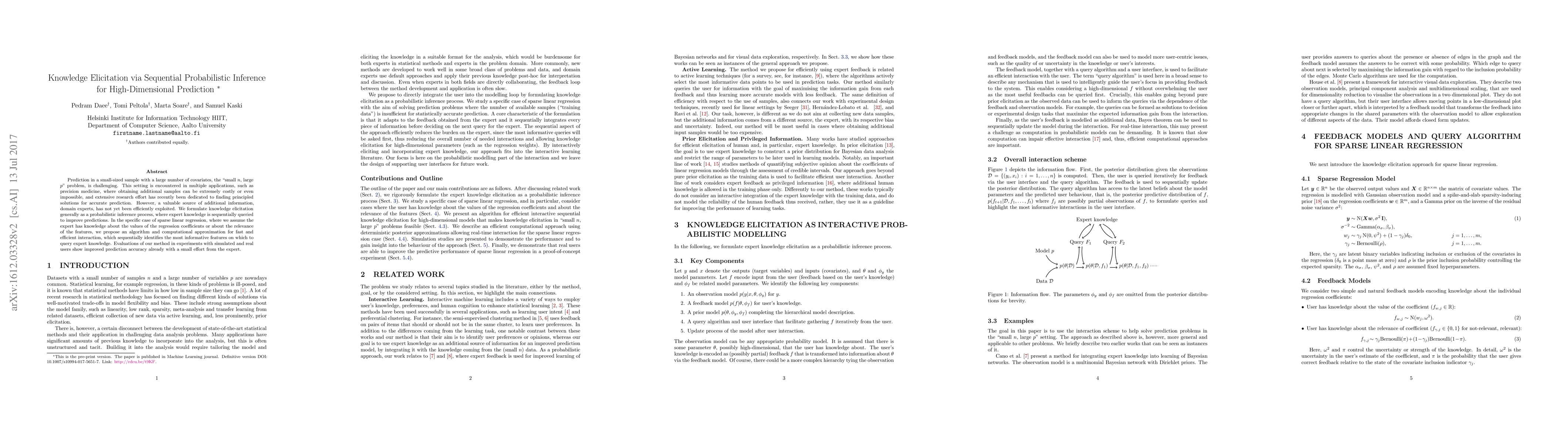 Prediction in a small-sized sample with a large number of covariates, the "small n, large p" problem, is challenging. This setting is encountered in multiple applications, such as precision medicine, where obtaining additional samples can be extremely costly or even impossible, and extensive research effort has recently been dedicated to finding principled solutions for accurate prediction. However, a valuable source of additional information, domain experts, has not yet been efficiently exploited. We formulate knowledge elicitation generally as a probabilistic inference process, where expert knowledge is sequentially queried to improve predictions. In the specific case of sparse linear regression, where we assume the expert has knowledge about the values of the regression coefficients or about the relevance of the features, we propose an algorithm and computational approximation for fast and efficient interaction, which sequentially identifies the most informative features on which to query expert knowledge. Evaluations of our method in experiments with simulated and real users show improved prediction accuracy already with a small effort from the expert.
