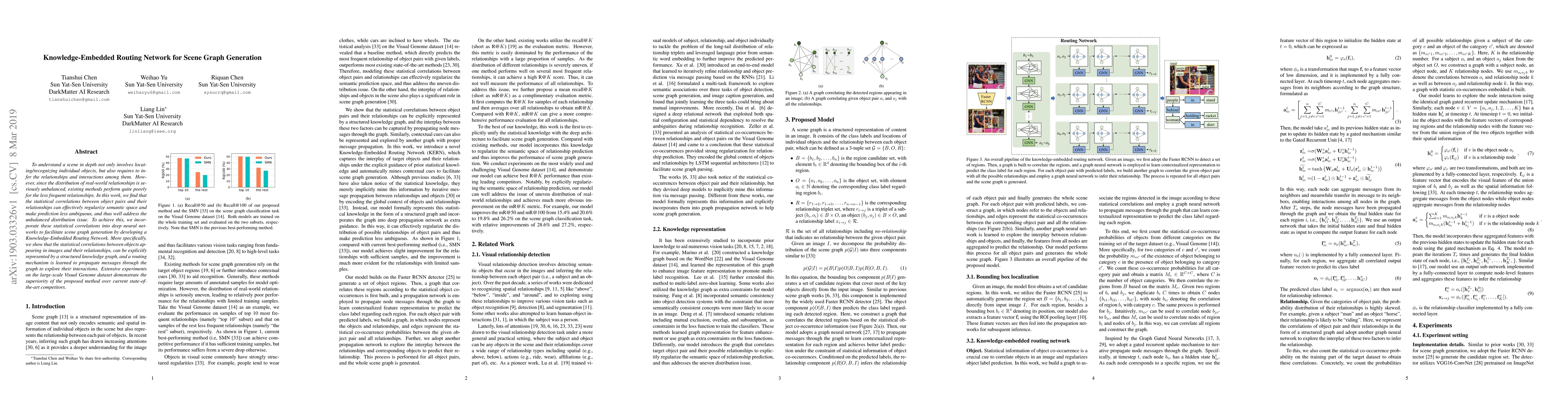 To understand a scene in depth not only involves locating/recognizing individual objects, but also requires to infer the relationships and interactions among them. However, since the distribution of real-world relationships is seriously unbalanced, existing methods perform quite poorly for the less frequent relationships. In this work, we find that the statistical correlations between object pairs and their relationships can effectively regularize semantic space and make prediction less ambiguous, and thus well address the unbalanced distribution issue. To achieve this, we incorporate these statistical correlations into deep neural networks to facilitate scene graph generation by developing a Knowledge-Embedded Routing Network. More specifically, we show that the statistical correlations between objects appearing in images and their relationships, can be explicitly represented by a structured knowledge graph, and a routing mechanism is learned to propagate messages through the graph to explore their interactions. Extensive experiments on the large-scale Visual Genome dataset demonstrate the superiority of the proposed method over current state-of-the-art competitors.