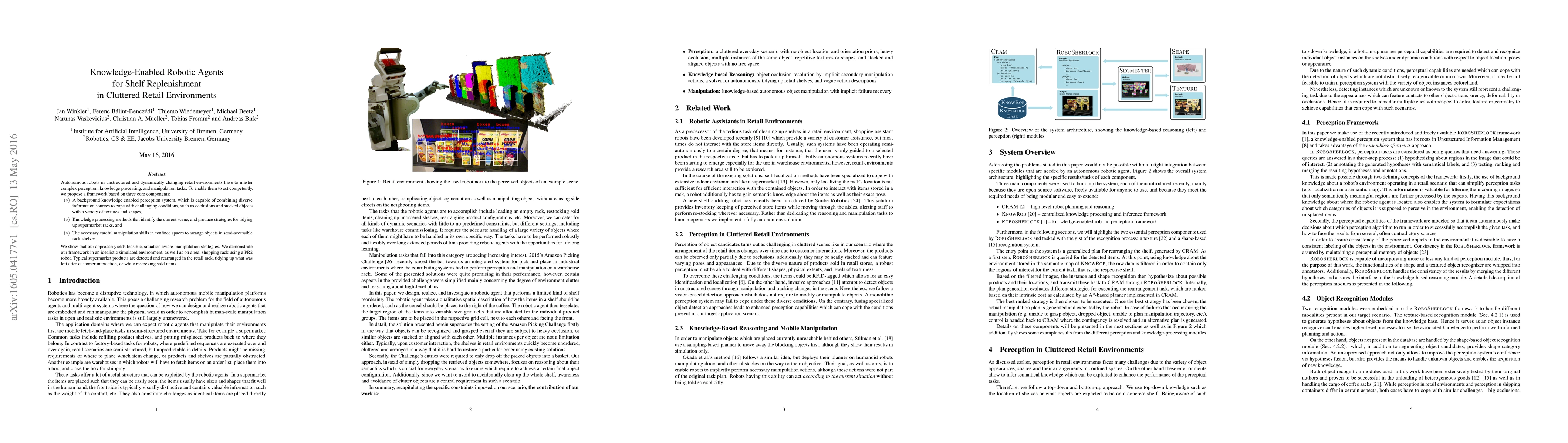 This paper proposes a framework for autonomous robots to efficiently manage shelf replenishment in cluttered retail environments, featuring a perception system, knowledge processing for strategy development, and manipulation skills for confined space tasks. The framework is tested on a PR2 robot in both simulated and real-world settings.