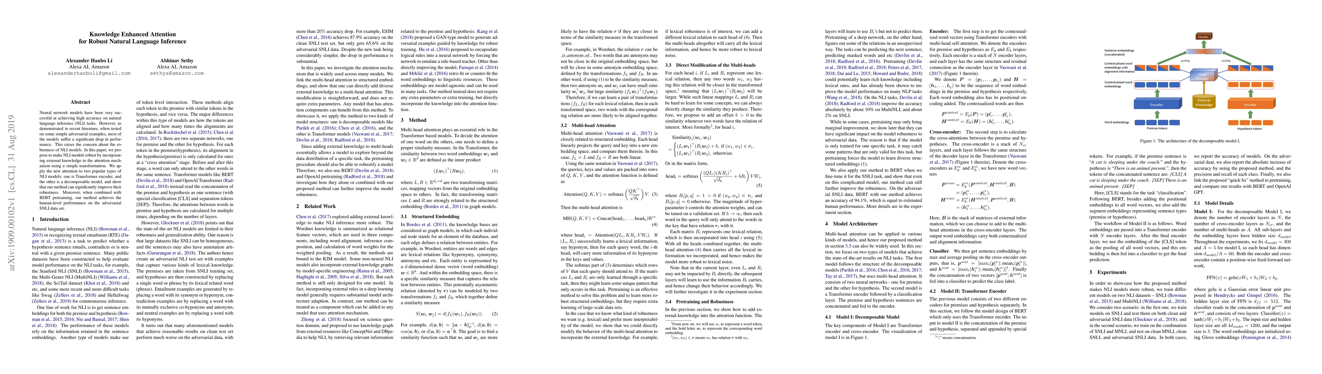 This paper proposes a method to enhance the robustness of natural language inference models by integrating external knowledge into the attention mechanism. The approach is applied to Transformer encoders and decomposable models, showing significant improvements in robustness, and achieves human-level performance when combined with BERT pretraining on adversarial examples.