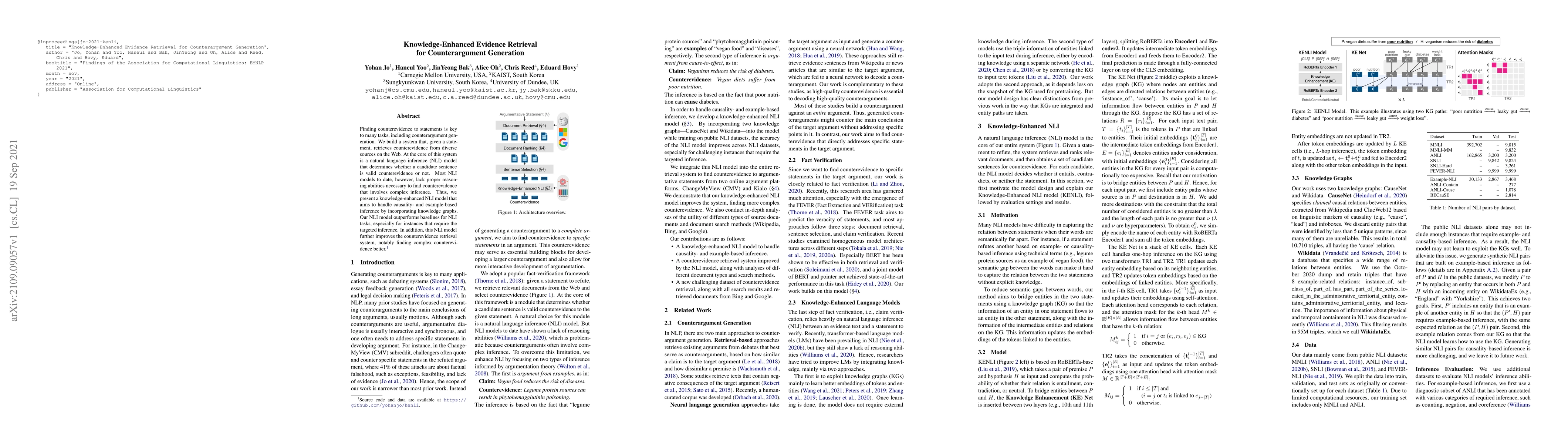 A new NLI model incorporating knowledge graphs improves counterevidence retrieval by handling complex inference, outperforming baselines in targeted instances.