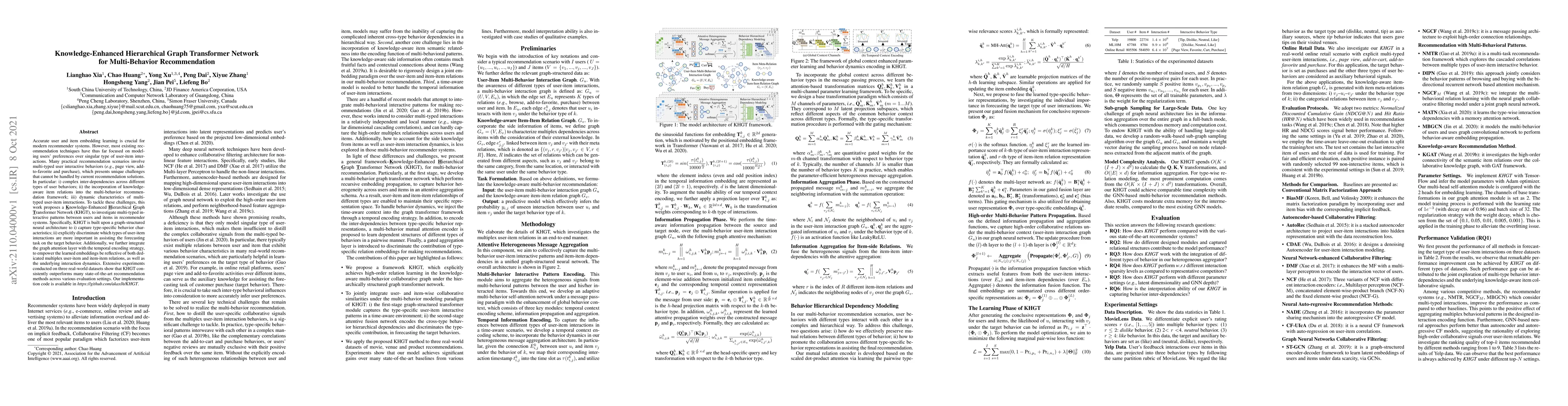 This paper proposes a Knowledge-Enhanced Hierarchical Graph Transformer Network (KHGT) to address multi-behavior recommendation challenges, including complex inter-dependencies across different user behaviors, knowledge-aware item relations, and dynamic interaction characteristics. KHGT outperforms state-of-the-art methods in experiments on three datasets.