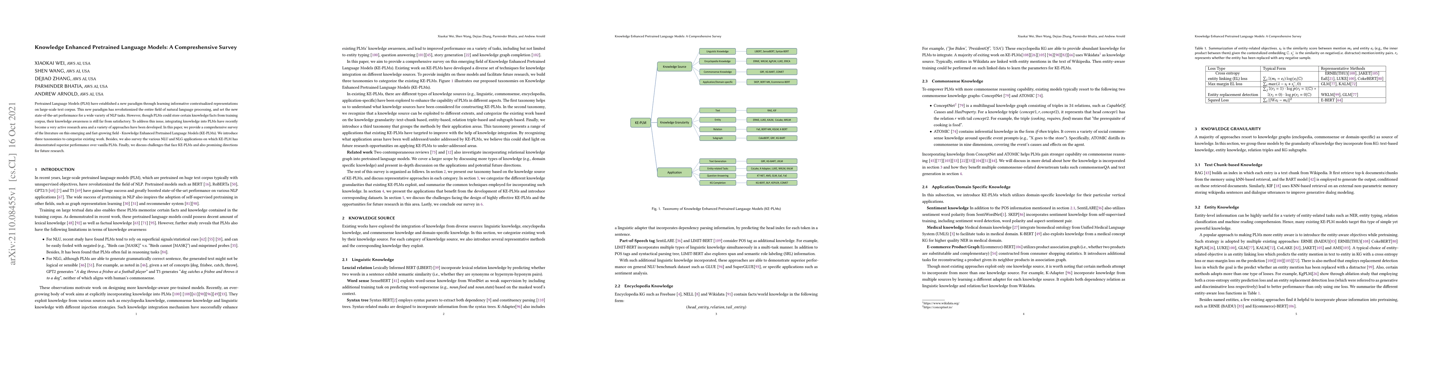 This paper provides a comprehensive survey on Knowledge Enhanced Pretrained Language Models (KE-PLMs), categorizing existing approaches into three taxonomies and highlighting their superior performance in various NLU and NLG applications. It also discusses challenges and future research directions in this emerging field.