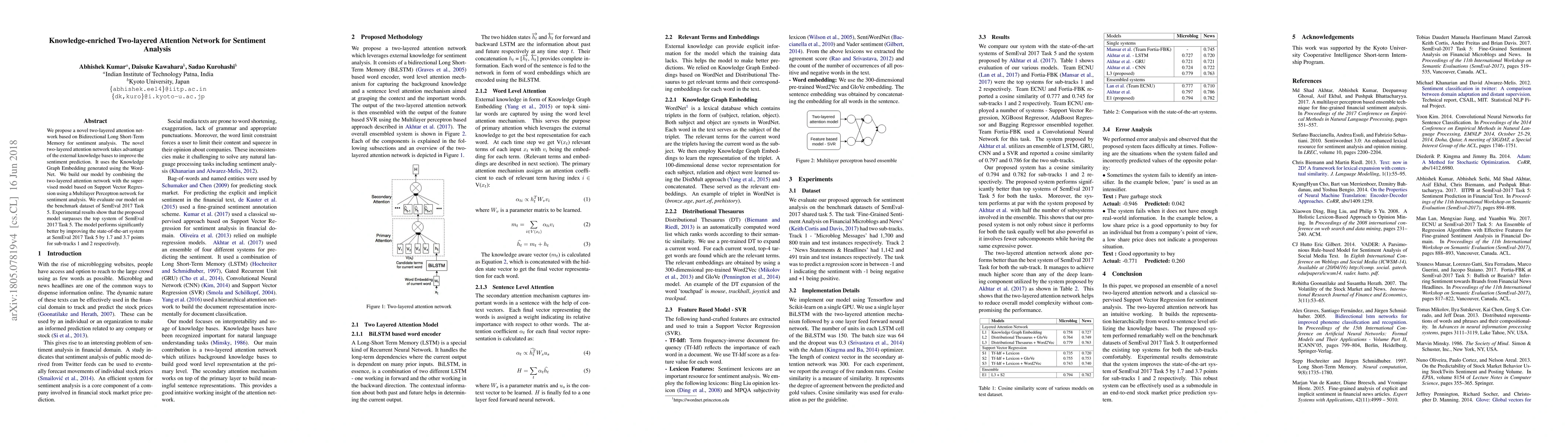 We propose a novel two-layered attention network based on Bidirectional Long Short-Term Memory for sentiment analysis. The novel two-layered attention network takes advantage of the external knowledge bases to improve the sentiment prediction. It uses the Knowledge Graph Embedding generated using the WordNet. We build our model by combining the two-layered attention network with the supervised model based on Support Vector Regression using a Multilayer Perceptron network for sentiment analysis. We evaluate our model on the benchmark dataset of SemEval 2017 Task 5. Experimental results show that the proposed model surpasses the top system of SemEval 2017 Task 5. The model performs significantly better by improving the state-of-the-art system at SemEval 2017 Task 5 by 1.7 and 3.7 points for sub-tracks 1 and 2 respectively.