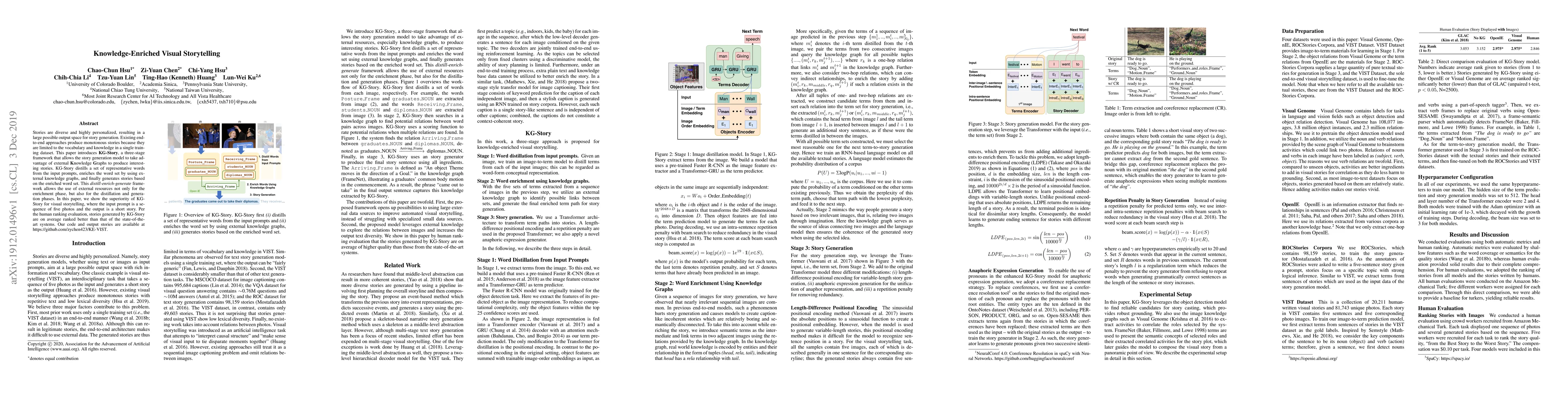 This paper proposes KG-Story, a three-stage framework that leverages external Knowledge Graphs to generate diverse and interesting stories from visual prompts. The framework distills, enriches, and generates stories, outperforming existing methods in human evaluations.