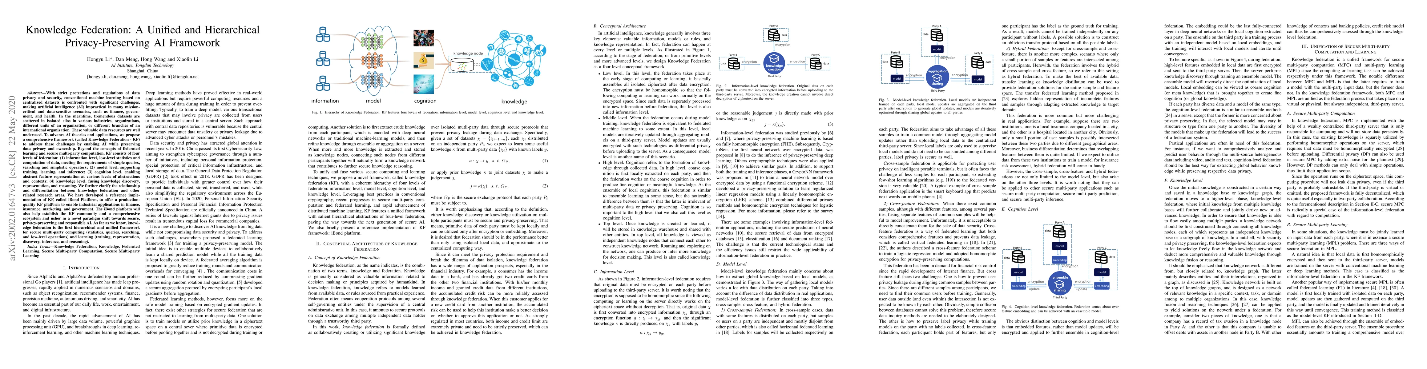 With strict protections and regulations of data privacy and security, conventional machine learning based on centralized datasets is confronted with significant challenges, making artificial intelligence (AI) impractical in many mission-critical and data-sensitive scenarios, such as finance, government, and health. In the meantime, tremendous datasets are scattered in isolated silos in various industries, organizations, different units of an organization, or different branches of an international organization. These valuable data resources are well underused. To advance AI theories and applications, we propose a comprehensive framework (called Knowledge Federation - KF) to address these challenges by enabling AI while preserving data privacy and ownership. Beyond the concepts of federated learning and secure multi-party computation, KF consists of four levels of federation: (1) information level, low-level statistics and computation of data, meeting the requirements of simple queries, searching and simplistic operators; (2) model level, supporting training, learning, and inference; (3) cognition level, enabling abstract feature representation at various levels of abstractions and contexts; (4) knowledge level, fusing knowledge discovery, representation, and reasoning. We further clarify the relationship and differentiation between knowledge federation and other related research areas. We have developed a reference implementation of KF, called iBond Platform, to offer a production-quality KF platform to enable industrial applications in finance, insurance et al. The iBond platform will also help establish the KF community and a comprehensive ecosystem and usher in a novel paradigm shift towards secure, privacy-preserving and responsible AI. As far as we know, knowledge federation is the first hierarchical and unified framework for secure multi-party computing and learning.