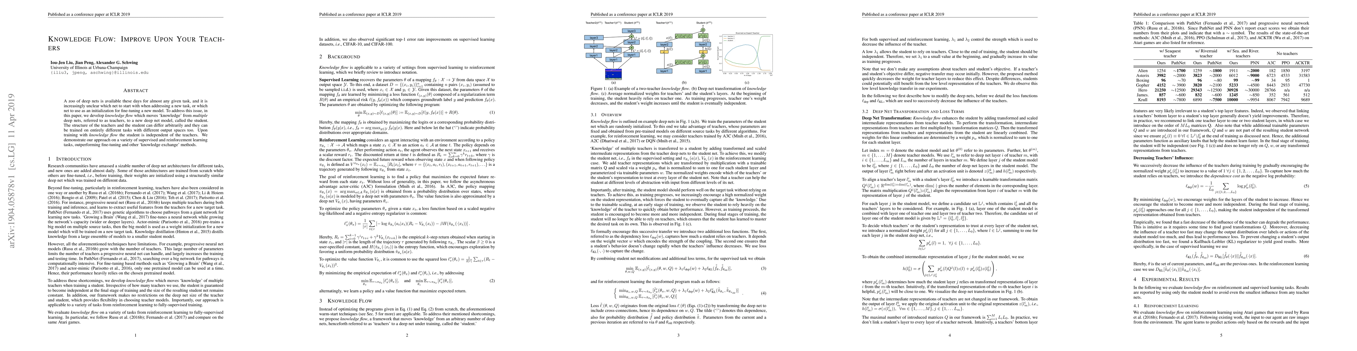 This paper introduces "knowledge flow," a method to transfer knowledge from multiple pre-trained deep neural networks (teachers) to a new model (student), regardless of differing structures and tasks. The student model, trained with this approach, outperforms traditional fine-tuning and other knowledge transfer methods across various supervised and reinforcement learning tasks.