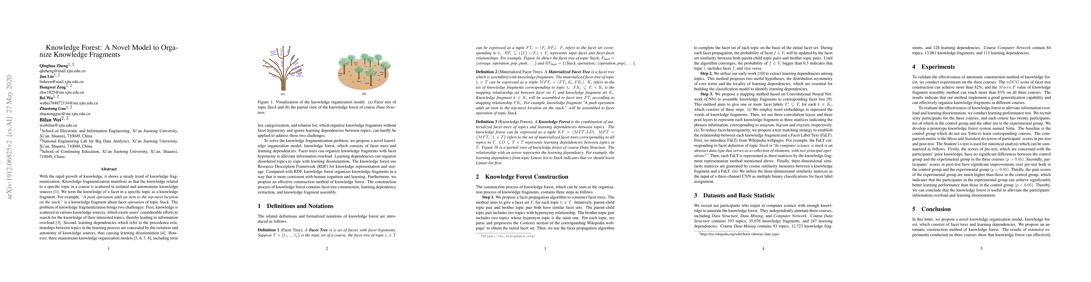 With the rapid growth of knowledge, it shows a steady trend of knowledge fragmentization. Knowledge fragmentization manifests as that the knowledge related to a specific topic in a course is scattered in isolated and autonomous knowledge sources. We term the knowledge of a facet in a specific topic as a knowledge fragment. The problem of knowledge fragmentization brings two challenges: First, knowledge is scattered in various knowledge sources, which exerts users' considerable efforts to search for the knowledge of their interested topics, thereby leading to information overload. Second, learning dependencies which refer to the precedence relationships between topics in the learning process are concealed by the isolation and autonomy of knowledge sources, thus causing learning disorientation. To solve the knowledge fragmentization problem, we propose a novel knowledge organization model, knowledge forest, which consists of facet trees and learning dependencies. Facet trees can organize knowledge fragments with facet hyponymy to alleviate information overload. Learning dependencies can organize disordered topics to cope with learning disorientation. We conduct extensive experiments on three manually constructed datasets from the Data Structure, Data Mining, and Computer Network courses, and the experimental results show that knowledge forest can effectively organize knowledge fragments, and alleviate information overload and learning disorientation.