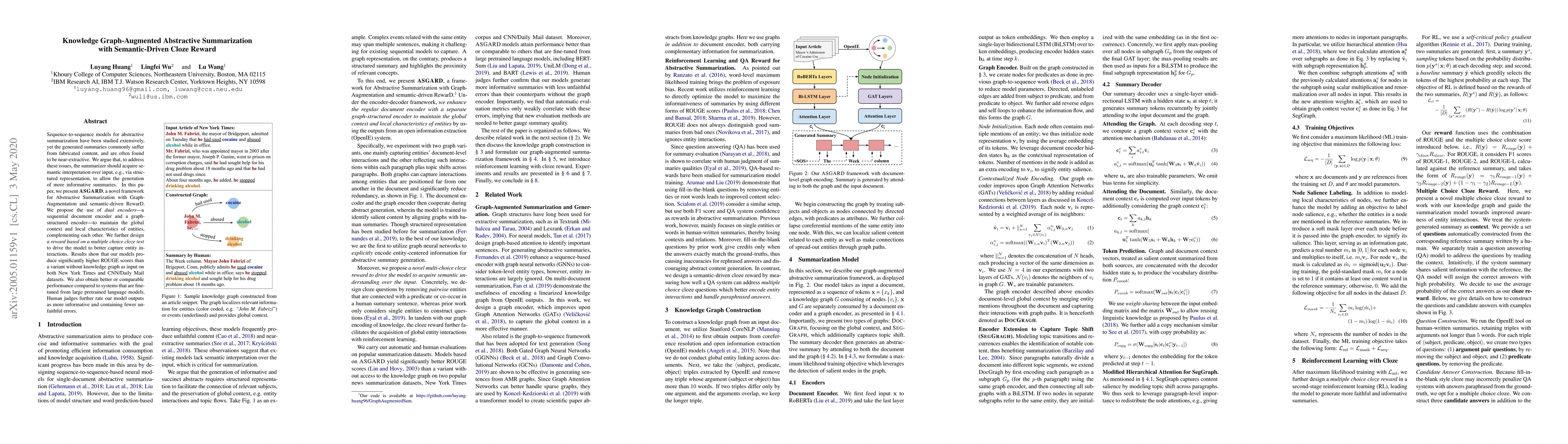 This paper introduces ASGARD, a novel framework for enhancing abstractive summarization using knowledge graph augmentation and a semantic-driven reward mechanism. The proposed dual encoders and cloze test-based reward aim to generate more informative and accurate summaries, achieving better performance on standard datasets compared to traditional models.