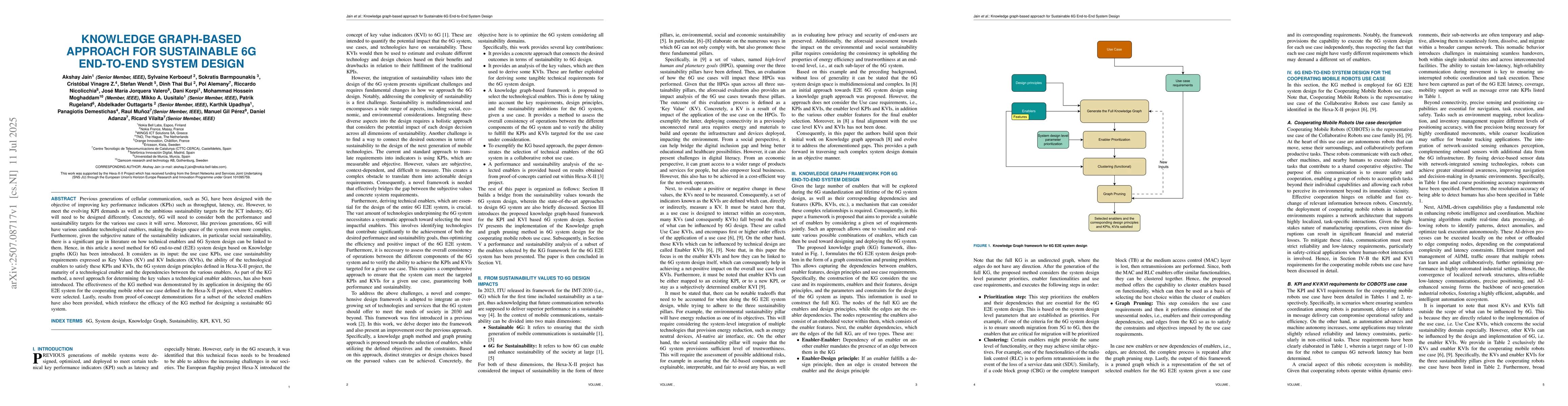 Previous generations of cellular communication, such as 5G, have been designed with the objective of improving key performance indicators (KPIs) such as throughput, latency, etc. However, to meet the evolving KPI demands as well as the ambitious sustainability targets for the ICT industry, 6G will need to be designed differently. Concretely, 6G will need to consider both the performance and sustainability targets for the various use cases it will serve. Moreover, like previous generations, 6G will have various candidate technological enablers, making the design space of the system even more complex. Furthermore, given the subjective nature of the sustainability indicators, in particular social sustainability, there is a significant gap in literature on how technical enablers and 6G System design can be linked to them. Hence, in this article a novel method for 6G end-to-end (E2E) system design based on Knowledge graphs (KG) has been introduced. It considers as its input: the use case KPIs, use case sustainability requirements expressed as Key Values (KV) and KV Indicators (KVIs), the ability of the technological enablers to satisfy these KPIs and KVIs, the 6G system design principles defined in Hexa-X-II project, the maturity of a technological enabler and the dependencies between the various enablers. As part of the KG method, a novel approach for determining the key values a technological enabler addresses, has also been introduced. The effectiveness of the KG method was demonstrated by its application in designing the 6G E2E system for the cooperating mobile robot use case defined in the Hexa-X-II project, where 82 enablers were selected. Lastly, results from proof-of-concept demonstrations for a subset of the selected enablers have also been provided, which reinforce the efficacy of the KG method for designing a sustainable 6G system.