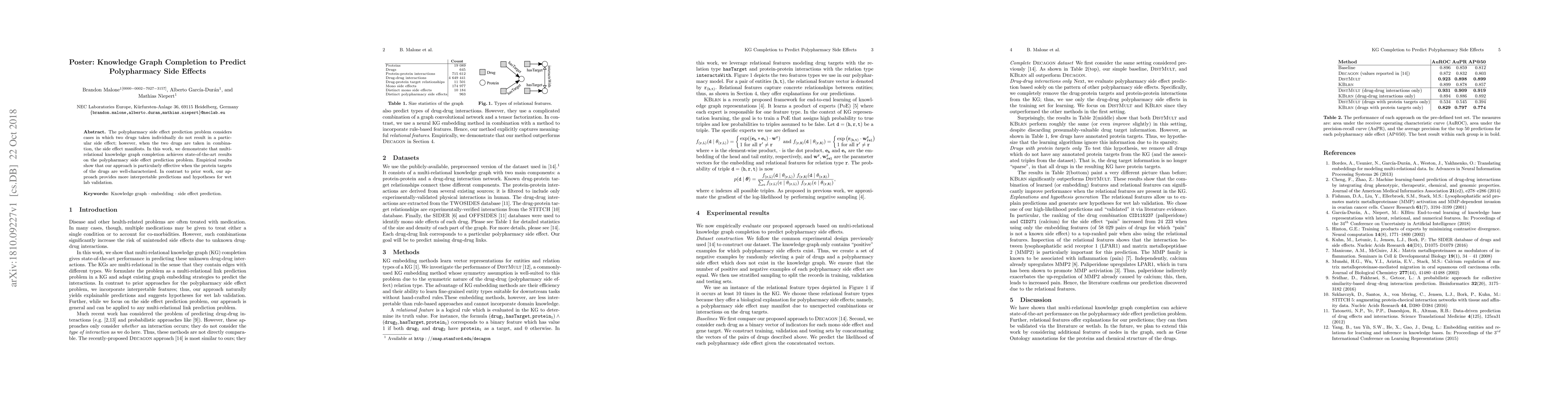 This research proposes a knowledge graph completion method for predicting side effects resulting from drug combinations, achieving state-of-the-art results. It demonstrates improved interpretability and provides actionable hypotheses for experimental validation, especially when drug protein targets are well-documented.