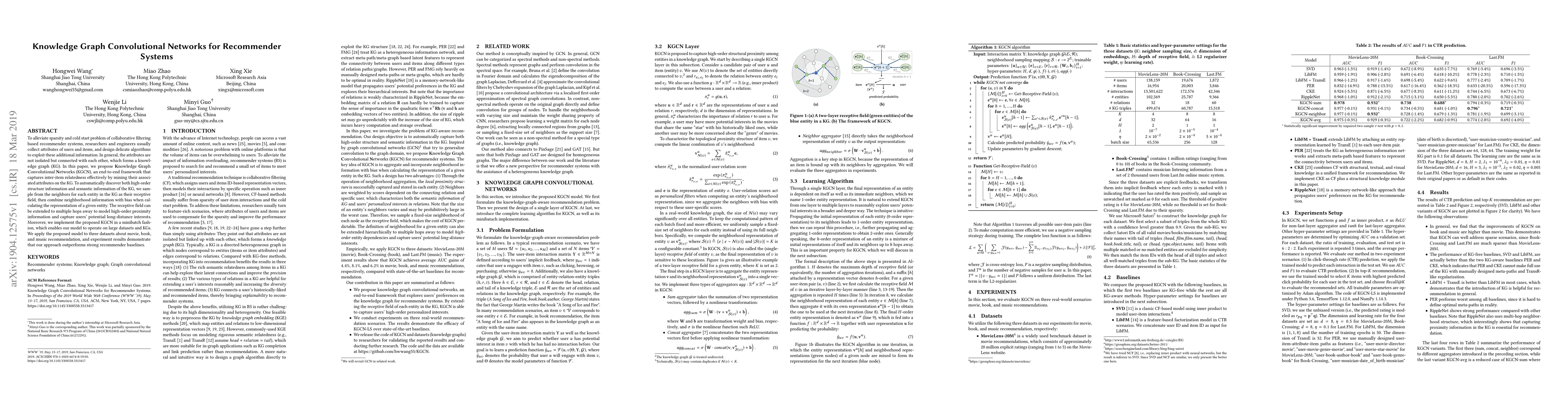 This paper introduces Knowledge Graph Convolutional Networks (KGCN) to tackle the sparsity and cold start issues in recommender systems by leveraging a knowledge graph. KGCN captures inter-item relatedness by mining attributes, sampling neighbors for receptive fields, and extending to model high-order proximity, ultimately outperforming traditional recommender baselines on movie, book, and music datasets.