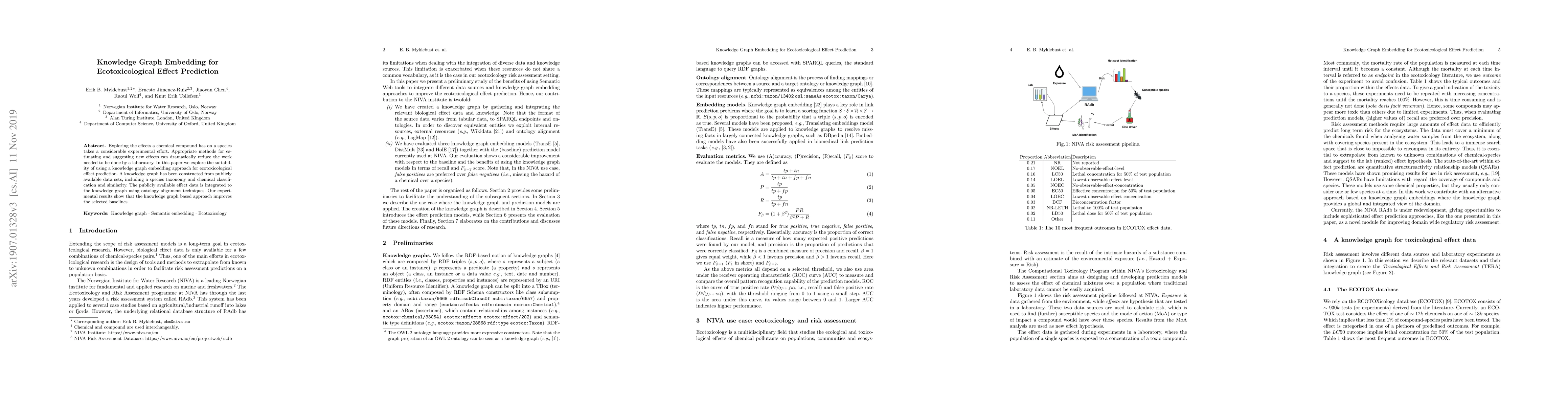 This paper investigates the use of knowledge graph embedding to predict ecotoxicological effects of chemical compounds, reducing the need for extensive laboratory experiments. The authors construct a knowledge graph from public datasets and integrate effect data using ontology alignment, demonstrating improved prediction performance over baseline methods.