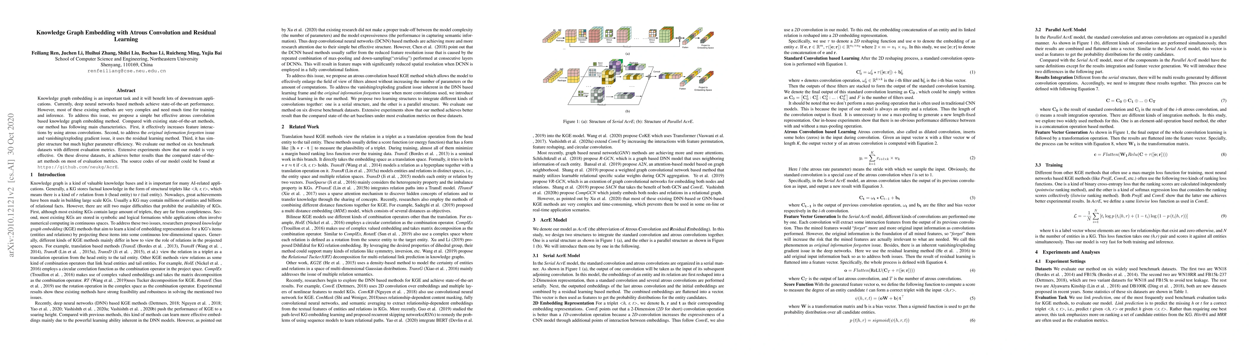 The paper proposes AcrE, a DNN-based KGE model using atrous convolution and residual learning. It compares AcrE with state-of-the-art methods on six benchmark datasets.