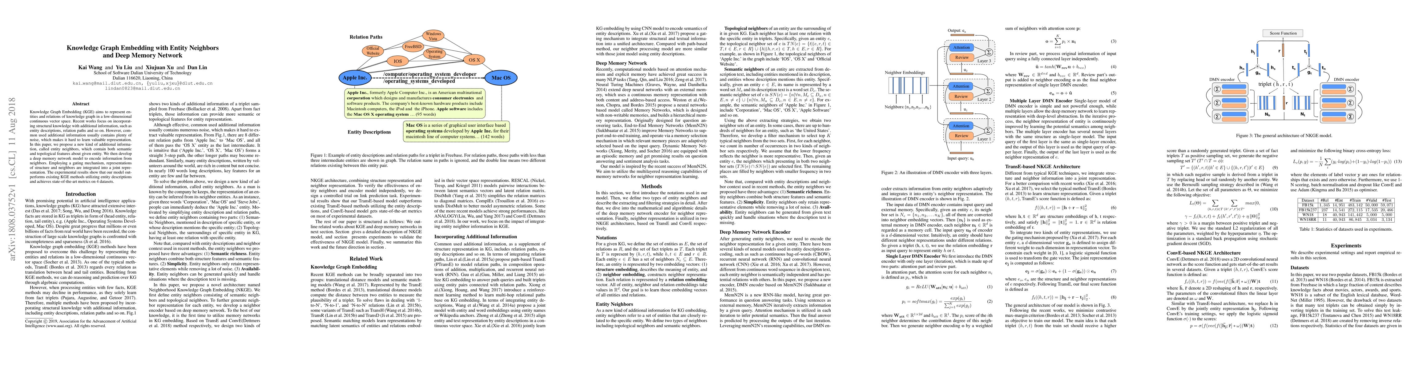 This paper proposes a novel Knowledge Graph Embedding method that utilizes entity neighbors for low-dimensional vector representation, incorporating both semantic and topological information. A deep memory network model is developed to encode this information, achieving superior performance over existing methods on 4 datasets.