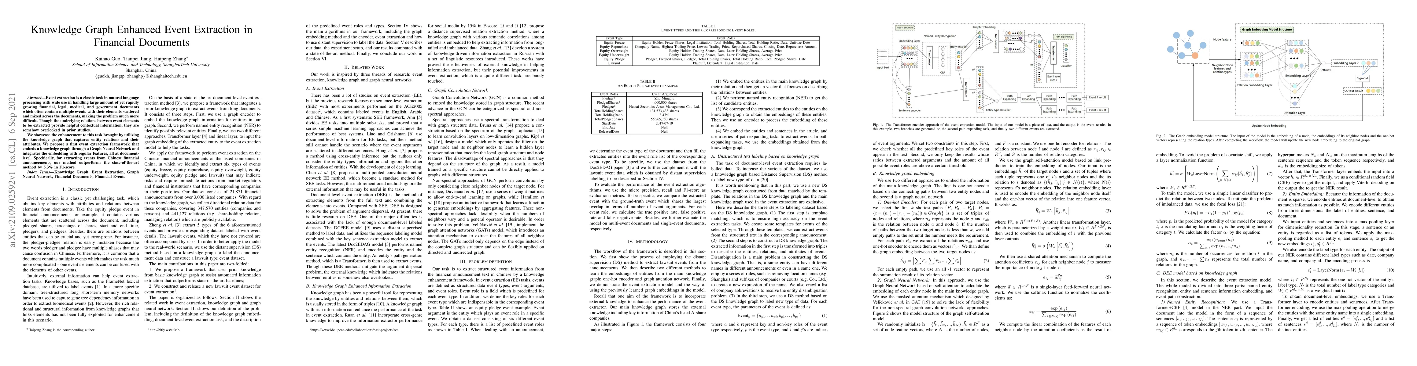 The paper proposes a knowledge graph enhanced event extraction framework for financial documents, integrating a Graph Neural Network to embed the knowledge graph and combine it with regular features at the document level. This method significantly outperforms the state-of-the-art method by 5.3% in F1-score for extracting events from Chinese financial announcements.