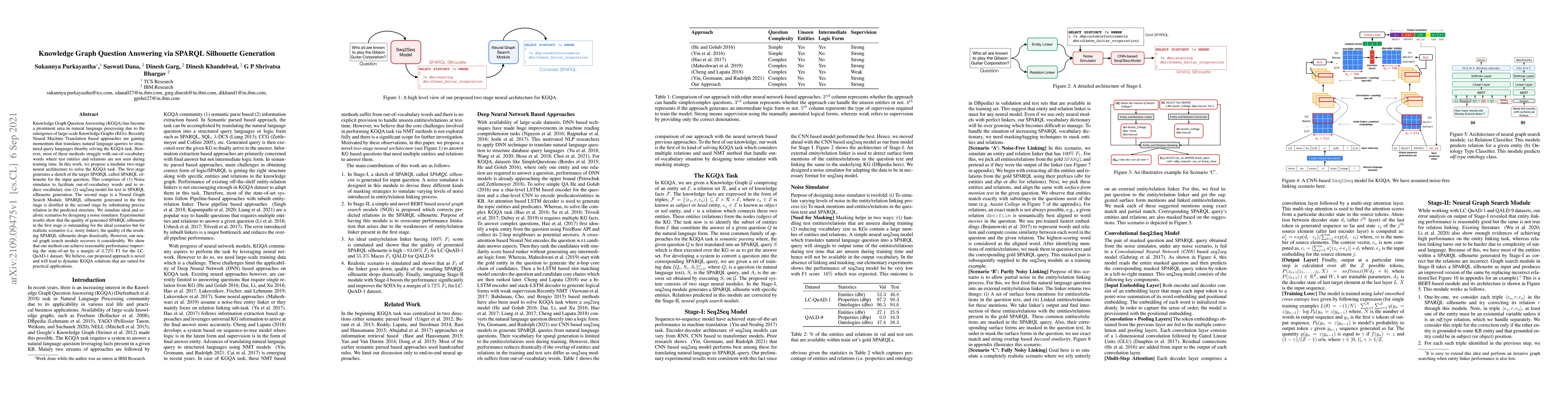 This paper proposes a two-stage neural architecture for Knowledge Graph Question Answering (KGQA) that generates a SPARQL silhouette to handle out-of-vocabulary words. The first stage uses a noise simulator and seq2seq model to generate a SPARQL silhouette, while the second stage refines it using a Neural Graph Search Module. Experimental results show improved performance over state-of-the-art methods by 3.72% F1 on the LC-QuAD-1 dataset.