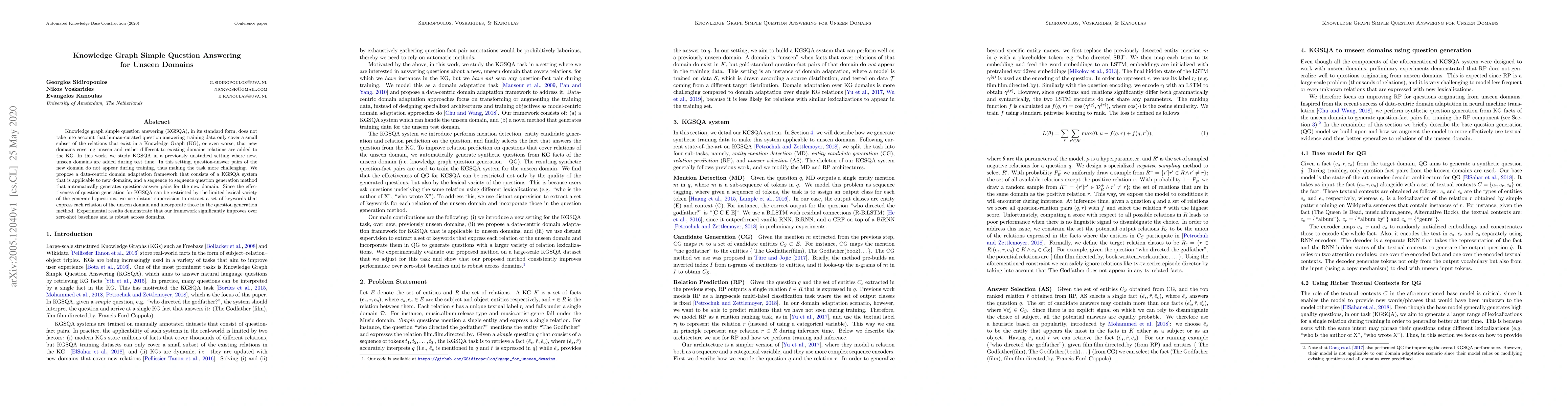 Knowledge graph simple question answering (KGSQA), in its standard form, does not take into account that human-curated question answering training data only cover a small subset of the relations that exist in a Knowledge Graph (KG), or even worse, that new domains covering unseen and rather different to existing domains relations are added to the KG. In this work, we study KGSQA in a previously unstudied setting where new, unseen domains are added during test time. In this setting, question-answer pairs of the new domain do not appear during training, thus making the task more challenging. We propose a data-centric domain adaptation framework that consists of a KGSQA system that is applicable to new domains, and a sequence to sequence question generation method that automatically generates question-answer pairs for the new domain. Since the effectiveness of question generation for KGSQA can be restricted by the limited lexical variety of the generated questions, we use distant supervision to extract a set of keywords that express each relation of the unseen domain and incorporate those in the question generation method. Experimental results demonstrate that our framework significantly improves over zero-shot baselines and is robust across domains.