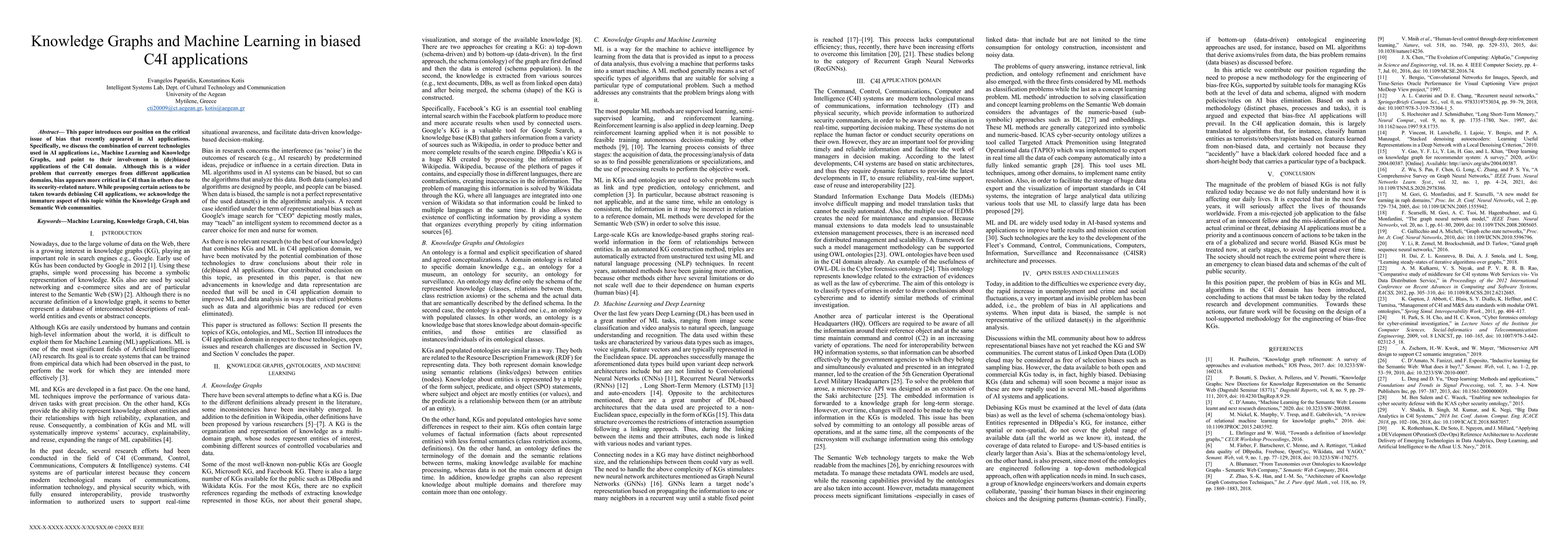 This paper introduces our position on the critical issue of bias that recently appeared in AI applications. Specifically, we discuss the combination of current technologies used in AI applications i.e., Machine Learning and Knowledge Graphs, and point to their involvement in (de)biased applications of the C4I domain. Although this is a wider problem that currently emerges from different application domains, bias appears more critical in C4I than in others due to its security-related nature. While proposing certain actions to be taken towards debiasing C4I applications, we acknowledge the immature aspect of this topic within the Knowledge Graph and Semantic Web communities.