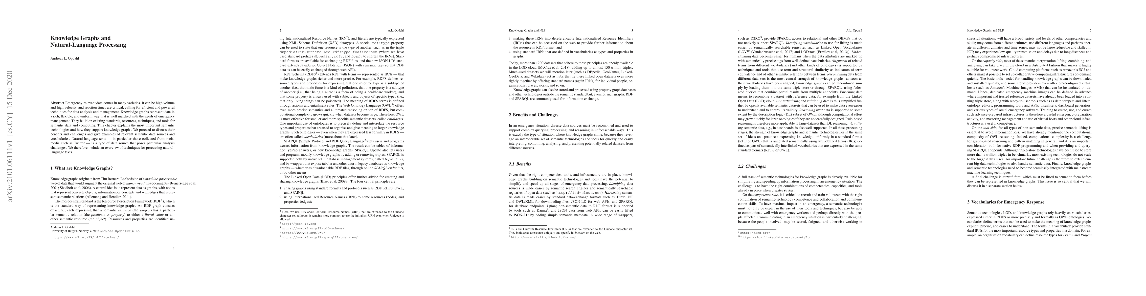 This paper explores how knowledge graphs enhance emergency management through efficient data analysis, leveraging semantic technologies to manage high-volume, high-velocity data. It discusses the benefits and challenges of knowledge graphs and includes an overview of natural-language processing techniques for analyzing social media texts.