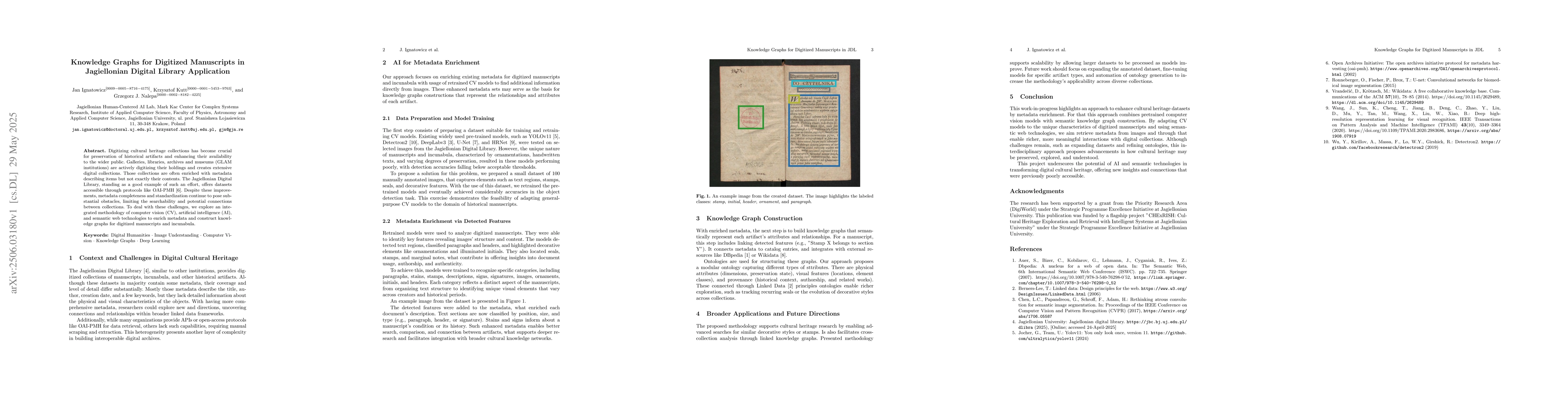 Digitizing cultural heritage collections has become crucial for preservation of historical artifacts and enhancing their availability to the wider public. Galleries, libraries, archives and museums (GLAM institutions) are actively digitizing their holdings and creates extensive digital collections. Those collections are often enriched with metadata describing items but not exactly their contents. The Jagiellonian Digital Library, standing as a good example of such an effort, offers datasets accessible through protocols like OAI-PMH. Despite these improvements, metadata completeness and standardization continue to pose substantial obstacles, limiting the searchability and potential connections between collections. To deal with these challenges, we explore an integrated methodology of computer vision (CV), artificial intelligence (AI), and semantic web technologies to enrich metadata and construct knowledge graphs for digitized manuscripts and incunabula.
