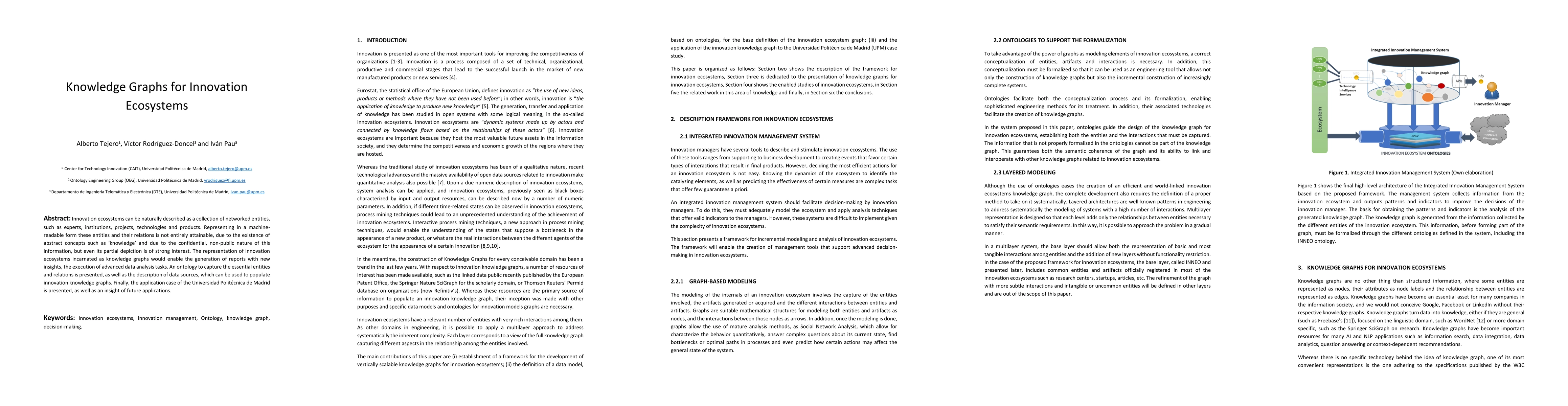 This paper proposes using knowledge graphs to represent innovation ecosystems, enabling new insights and data analysis tasks, with a focus on capturing essential entities and relations.