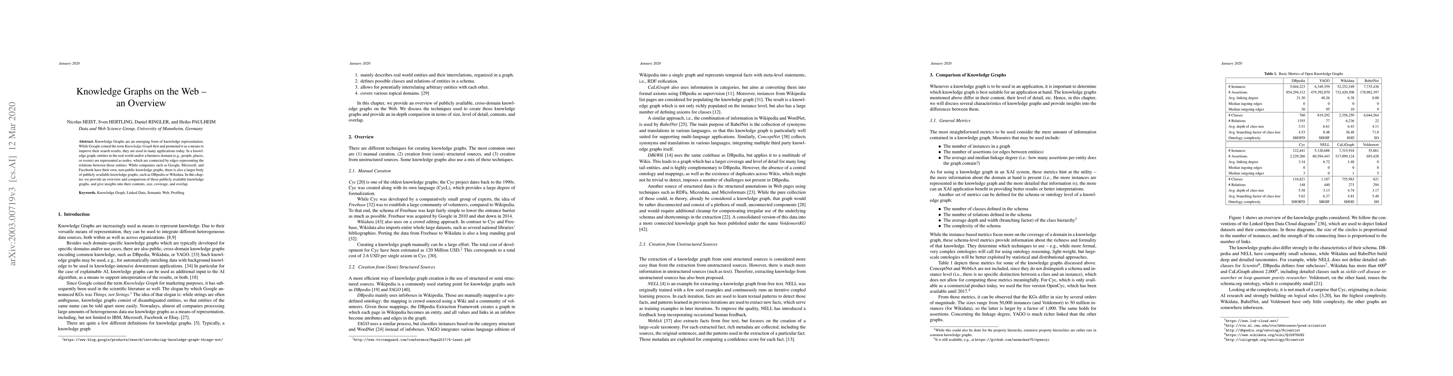 Knowledge Graphs are an emerging form of knowledge representation. While Google coined the term Knowledge Graph first and promoted it as a means to improve their search results, they are used in many applications today. In a knowledge graph, entities in the real world and/or a business domain (e.g., people, places, or events) are represented as nodes, which are connected by edges representing the relations between those entities. While companies such as Google, Microsoft, and Facebook have their own, non-public knowledge graphs, there is also a larger body of publicly available knowledge graphs, such as DBpedia or Wikidata. In this chapter, we provide an overview and comparison of those publicly available knowledge graphs, and give insights into their contents, size, coverage, and overlap.