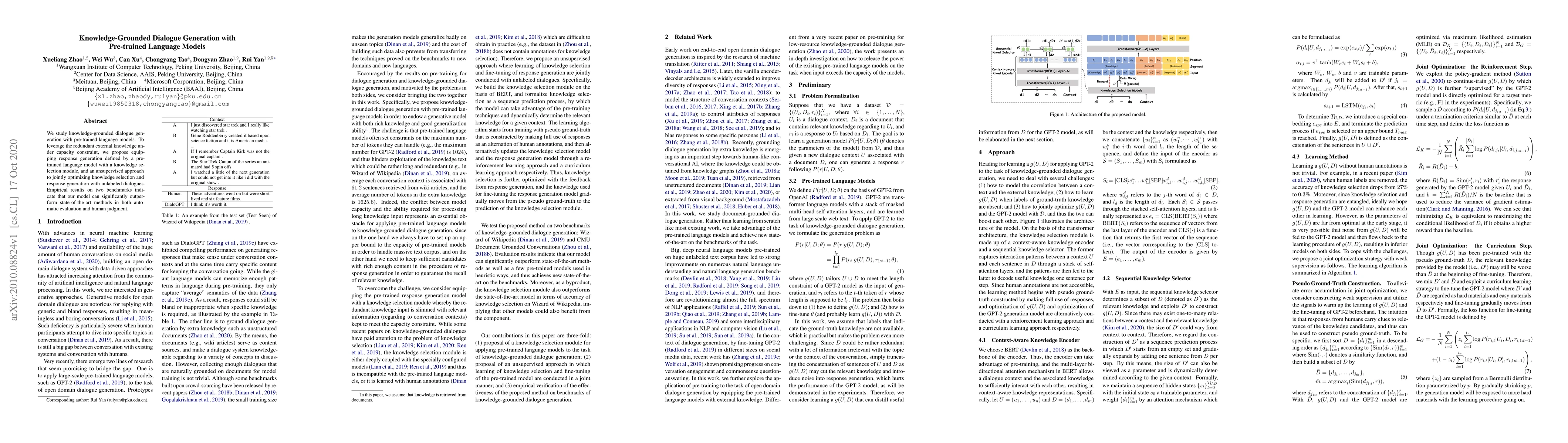 This paper proposes a method to enhance dialogue generation using pre-trained language models by integrating a knowledge selection module and an unsupervised optimization approach. The results show significant improvements over existing methods in both automatic metrics and human evaluations.