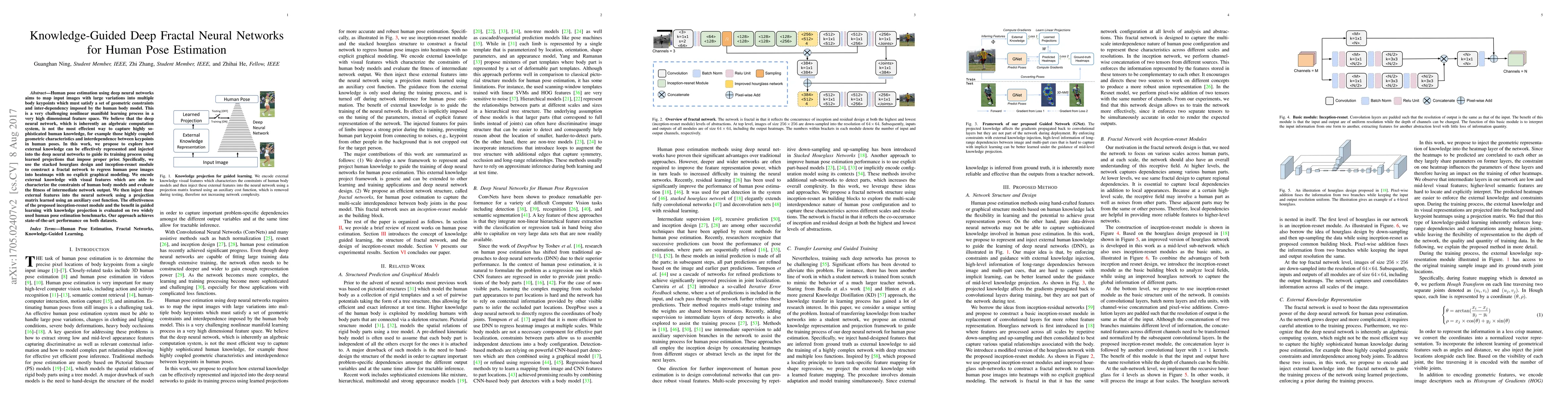 This paper proposes a knowledge-guided deep fractal neural network for human pose estimation, integrating external knowledge through learned projections to enhance the network's ability to capture geometric constraints and interdependencies between keypoints. The method achieves state-of-the-art performance on benchmark datasets.