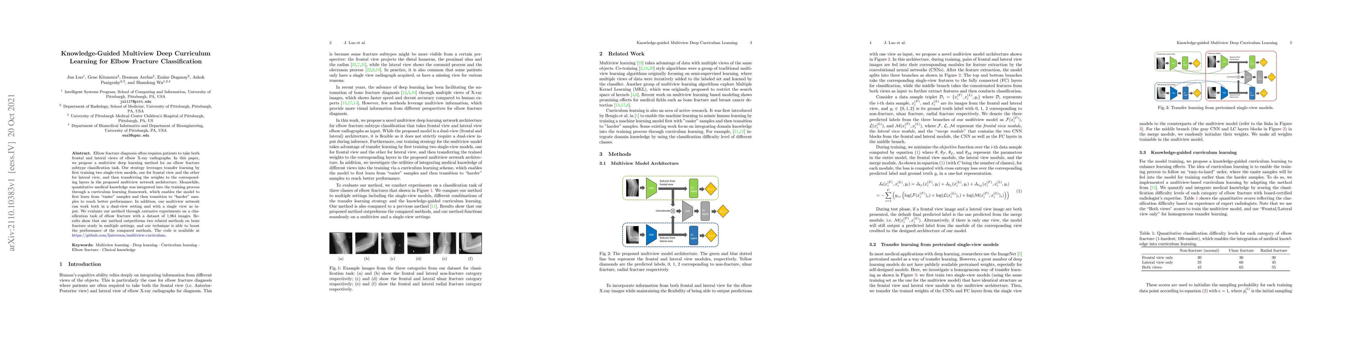 Elbow fracture diagnosis often requires patients to take both frontal and lateral views of elbow X-ray radiographs. In this paper, we propose a multiview deep learning method for an elbow fracture subtype classification task. Our strategy leverages transfer learning by first training two single-view models, one for frontal view and the other for lateral view, and then transferring the weights to the corresponding layers in the proposed multiview network architecture. Meanwhile, quantitative medical knowledge was integrated into the training process through a curriculum learning framework, which enables the model to first learn from "easier" samples and then transition to "harder" samples to reach better performance. In addition, our multiview network can work both in a dual-view setting and with a single view as input. We evaluate our method through extensive experiments on a classification task of elbow fracture with a dataset of 1,964 images. Results show that our method outperforms two related methods on bone fracture study in multiple settings, and our technique is able to boost the performance of the compared methods. The code is available at https://github.com/ljaiverson/multiview-curriculum.