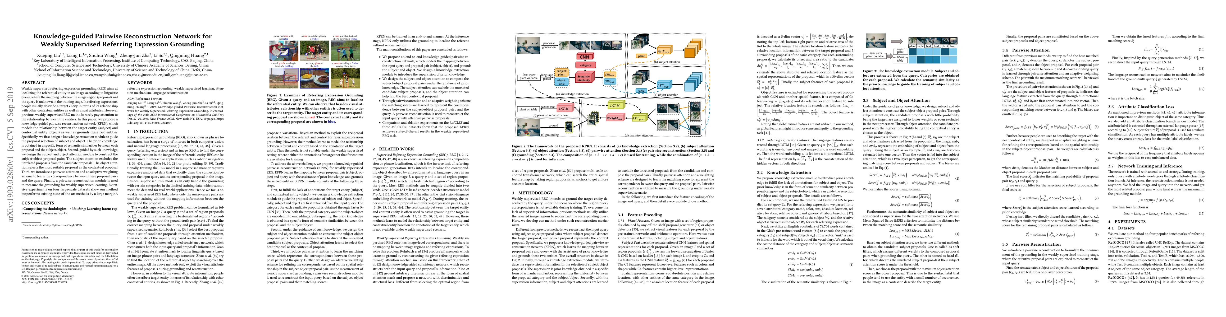 This paper proposes a knowledge-guided pairwise reconstruction network (KPRN) for weakly supervised referring expression grounding, which models relationships between target and contextual entities to improve localization accuracy. The KPRN uses knowledge extraction and attention modules to select and pair relevant image proposals, followed by a pairwise reconstruction module for effective learning.