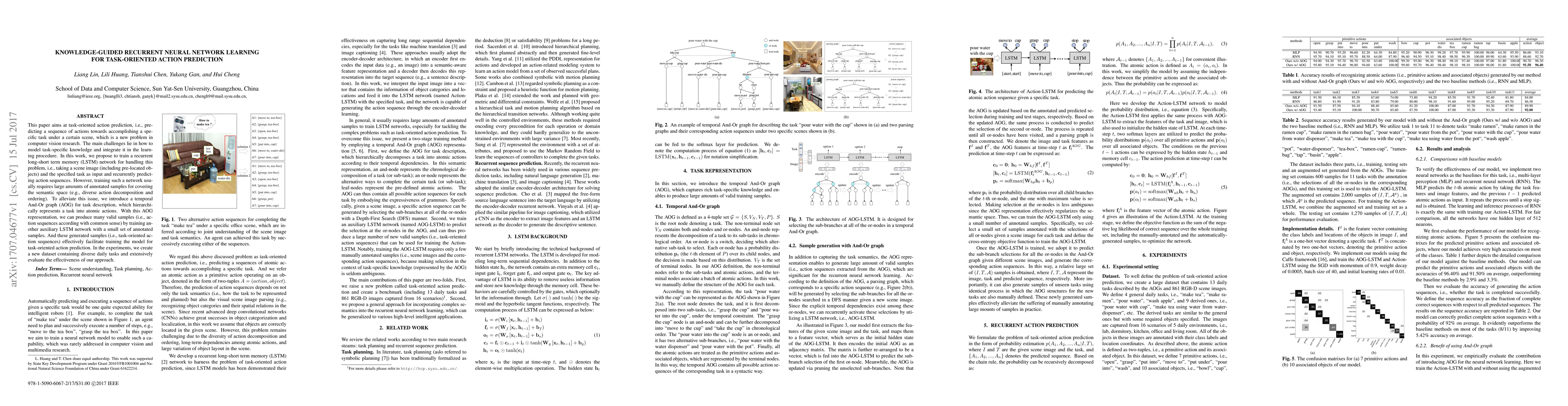 This paper aims at task-oriented action prediction, i.e., predicting a sequence of actions towards accomplishing a specific task under a certain scene, which is a new problem in computer vision research. The main challenges lie in how to model task-specific knowledge and integrate it in the learning procedure. In this work, we propose to train a recurrent long-short term memory (LSTM) network for handling this problem, i.e., taking a scene image (including pre-located objects) and the specified task as input and recurrently predicting action sequences. However, training such a network usually requires large amounts of annotated samples for covering the semantic space (e.g., diverse action decomposition and ordering). To alleviate this issue, we introduce a temporal And-Or graph (AOG) for task description, which hierarchically represents a task into atomic actions. With this AOG representation, we can produce many valid samples (i.e., action sequences according with common sense) by training another auxiliary LSTM network with a small set of annotated samples. And these generated samples (i.e., task-oriented action sequences) effectively facilitate training the model for task-oriented action prediction. In the experiments, we create a new dataset containing diverse daily tasks and extensively evaluate the effectiveness of our approach.