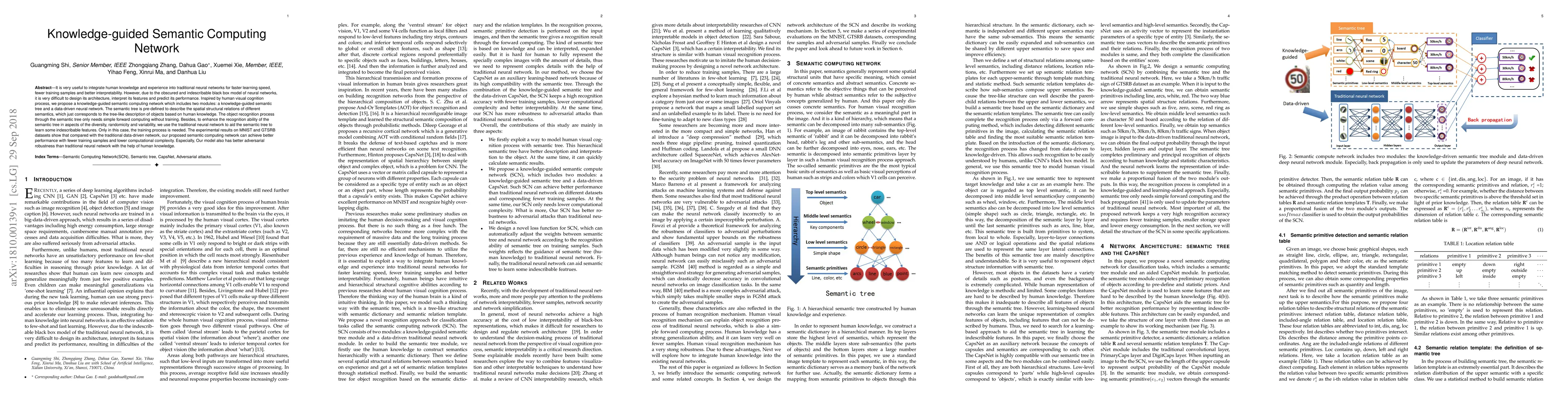The paper proposes a knowledge-guided semantic computing network that integrates human knowledge into neural networks to enhance learning speed, interpretability, and performance. The network combines a pre-defined semantic tree for object recognition without training and a neural network for learning complex features, resulting in better performance and robustness on MNIST and GTSRB datasets.