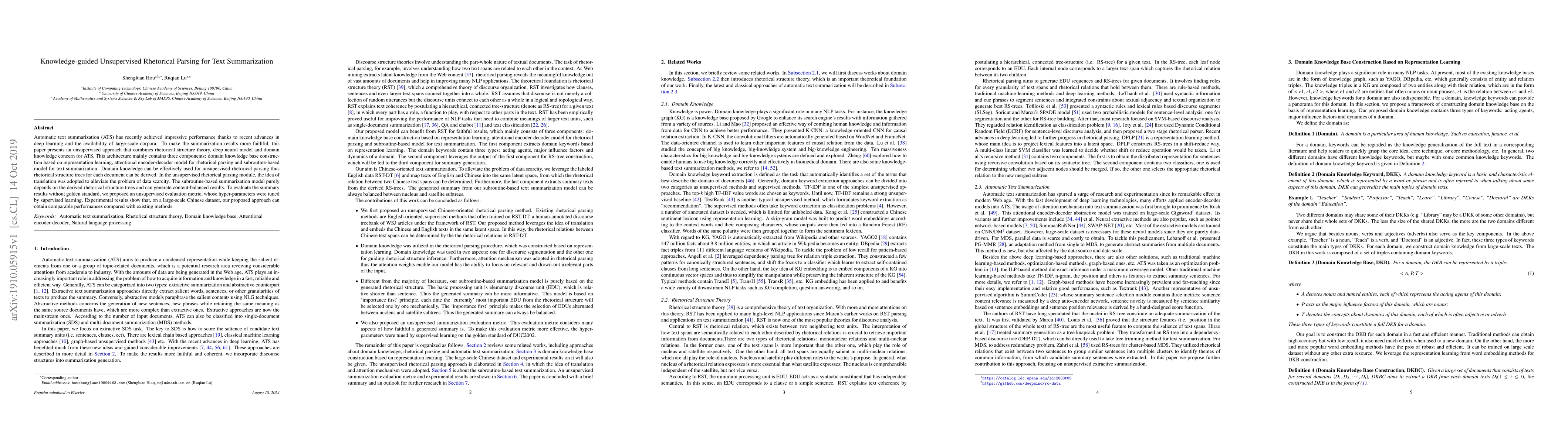 This paper introduces an unsupervised method for automatic text summarization that leverages domain knowledge and rhetorical structure theory. It employs an attentional encoder-decoder for rhetorical parsing and a subroutine-based summarization model, achieving content-balanced summaries on a large-scale Chinese dataset with competitive performance.