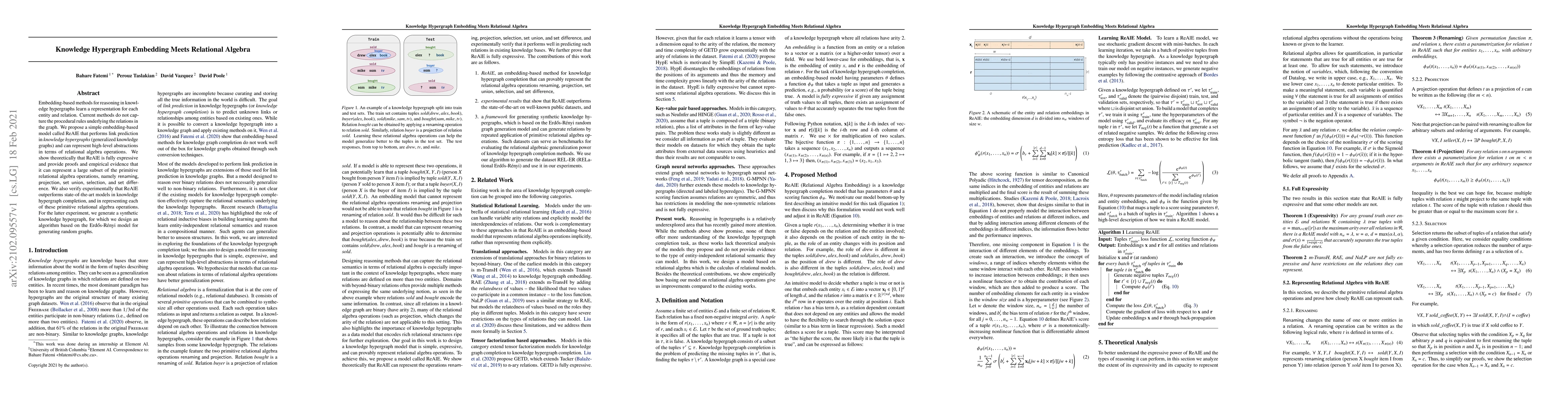 Embedding-based methods for reasoning in knowledge hypergraphs learn a representation for each entity and relation. Current methods do not capture the procedural rules underlying the relations in the graph. We propose a simple embedding-based model called ReAlE that performs link prediction in knowledge hypergraphs (generalized knowledge graphs) and can represent high-level abstractions in terms of relational algebra operations. We show theoretically that ReAlE is fully expressive and provide proofs and empirical evidence that it can represent a large subset of the primitive relational algebra operations, namely renaming, projection, set union, selection, and set difference. We also verify experimentally that ReAlE outperforms state-of-the-art models in knowledge hypergraph completion, and in representing each of these primitive relational algebra operations. For the latter experiment, we generate a synthetic knowledge hypergraph, for which we design an algorithm based on the Erdos-R'enyi model for generating random graphs.