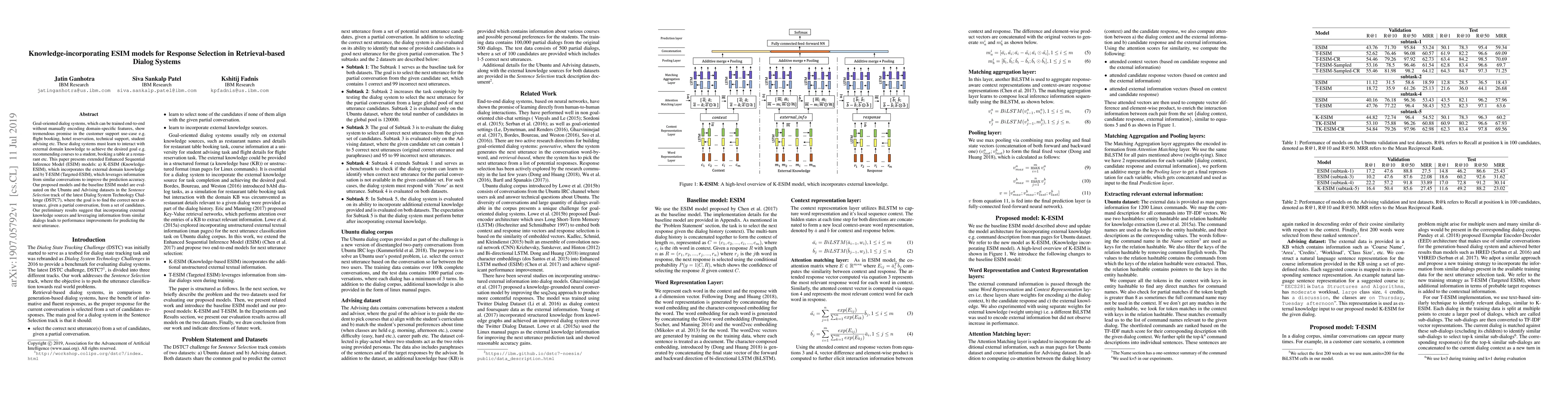 Goal-oriented dialog systems, which can be trained end-to-end without manually encoding domain-specific features, show tremendous promise in the customer support use-case e.g. flight booking, hotel reservation, technical support, student advising etc. These dialog systems must learn to interact with external domain knowledge to achieve the desired goal e.g. recommending courses to a student, booking a table at a restaurant etc. This paper presents extended Enhanced Sequential Inference Model (ESIM) models: a) K-ESIM (Knowledge-ESIM), which incorporates the external domain knowledge and b) T-ESIM (Targeted-ESIM), which leverages information from similar conversations to improve the prediction accuracy. Our proposed models and the baseline ESIM model are evaluated on the Ubuntu and Advising datasets in the Sentence Selection track of the latest Dialog System Technology Challenge (DSTC7), where the goal is to find the correct next utterance, given a partial conversation, from a set of candidates. Our preliminary results suggest that incorporating external knowledge sources and leveraging information from similar dialogs leads to performance improvements for predicting the next utterance.