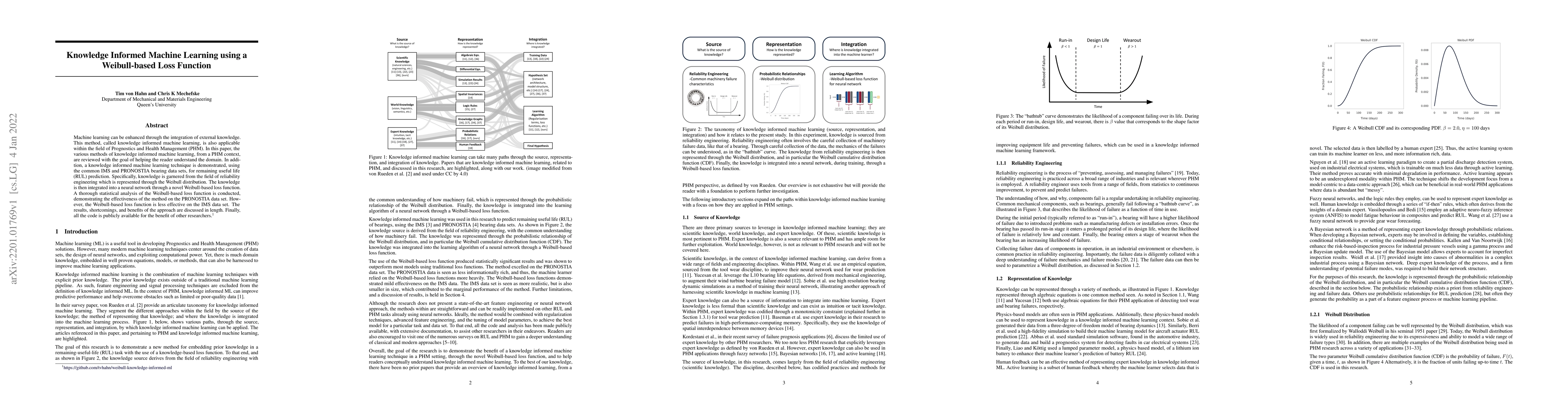 This paper reviews knowledge informed machine learning methods within Prognostics and Health Management, demonstrating a novel Weibull-based loss function for remaining useful life prediction using neural networks. While effective on the PRONOSTIA dataset, the approach shows limited success with the IMS dataset, highlighting both benefits and areas for improvement.
