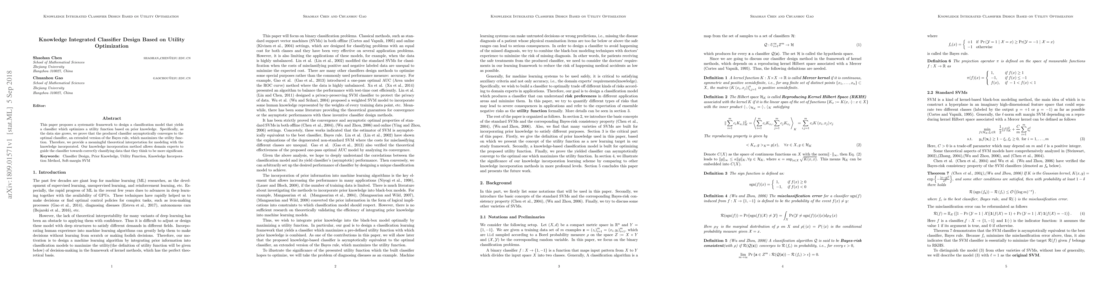 This paper proposes a systematic framework to design a classification model that yields a classifier which optimizes a utility function based on prior knowledge. Specifically, as the data size grows, we prove that the produced classifier asymptotically converges to the optimal classifier, an extended version of the Bayes rule, which maximizes the utility function. Therefore, we provide a meaningful theoretical interpretation for modeling with the knowledge incorporated. Our knowledge incorporation method allows domain experts to guide the classifier towards correctly classifying data that they think to be more significant.